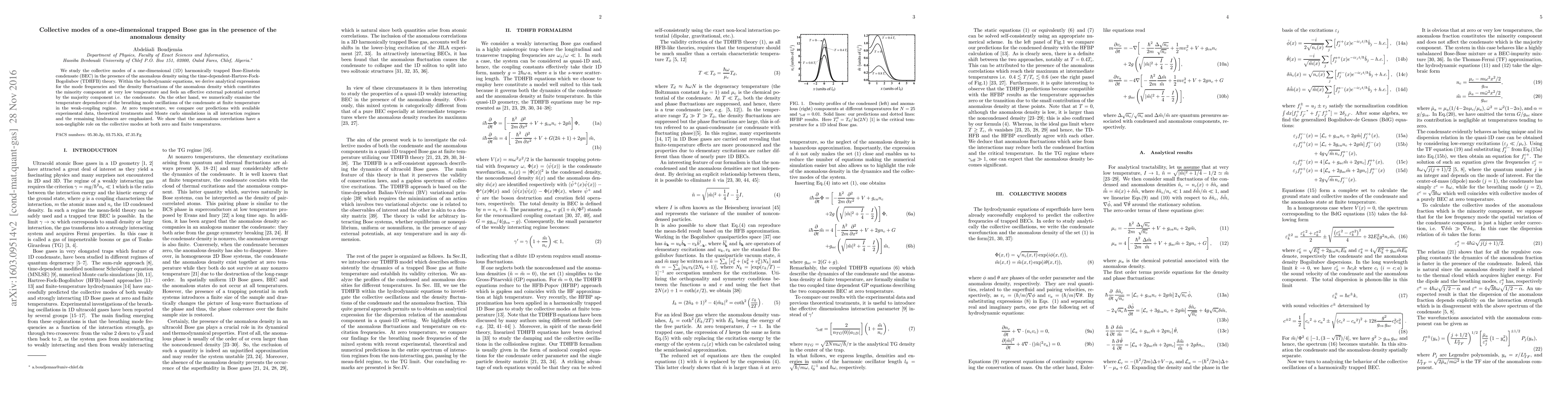 This paper investigates the collective modes of a one-dimensional trapped Bose gas using time-dependent Hartree-Fock-Bogoliubov theory, focusing on the anomalous density's influence. Analytical expressions for mode frequencies and density fluctuations are derived, and numerical studies examine breathing mode oscillations at finite temperatures.