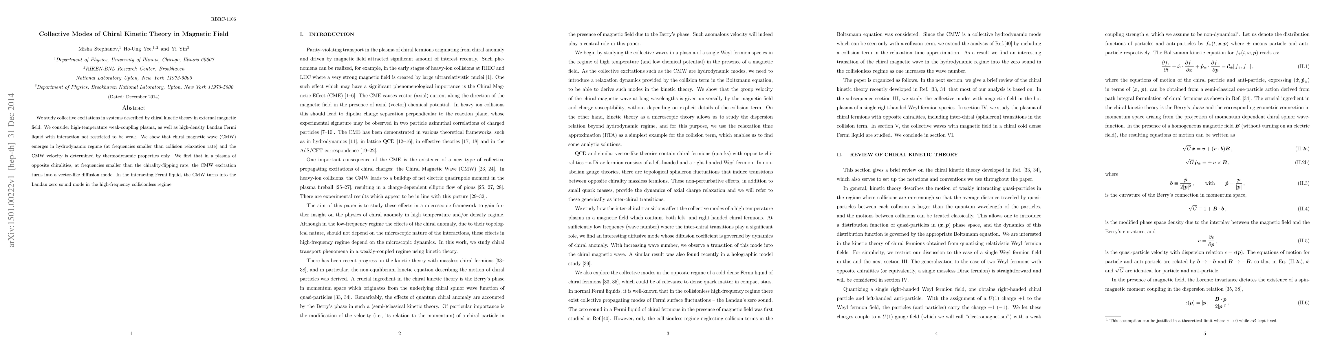 This paper explores collective excitations in chiral kinetic theory under magnetic fields, revealing the emergence of chiral magnetic waves in high-temperature plasmas and Fermi liquids. It demonstrates that the CMW transforms into a vector-like diffusion mode in chiral plasmas and a Landau zero sound mode in high-density Fermi liquids.
