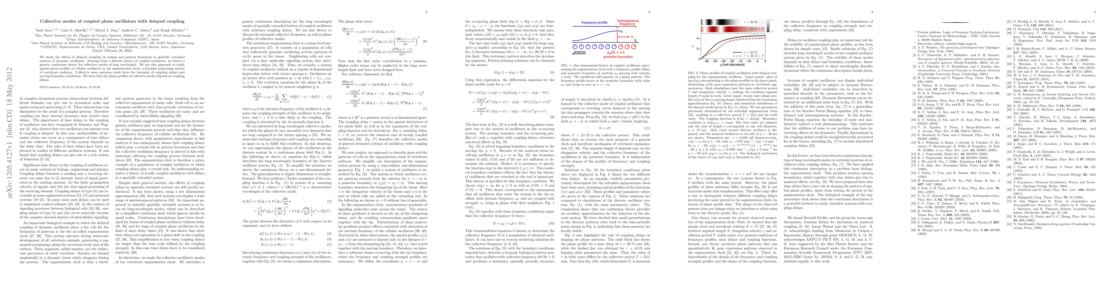 This paper investigates the impact of delayed coupling on timing and pattern formation in spatially extended oscillator systems, deriving a continuum theory for collective long-wavelength modes and applying it to the segmentation clock in vertebrate embryos, demonstrating that coupling delays significantly influence phase profiles.