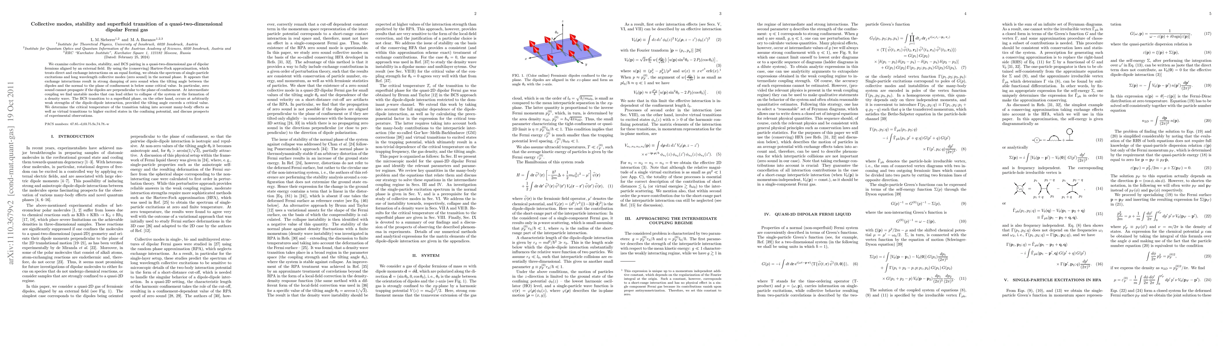We examine collective modes, stability, and BCS pairing in a quasi-two-dimensional gas of dipolar fermions aligned by an external field. By using the (conserving) Hartree-Fock approximation, which treats direct and exchange interactions on an equal footing, we obtain the spectrum of single-particle excitations and long wavelength collective modes (zero sound) in the normal phase. It appears that exchange interactions result in strong damping of zero sound when the tilting angle between the dipoles and the normal to the plane of confinement is below some critical value. In particular, zero sound cannot propagate if the dipoles are perpendicular to the plane of confinement. At intermediate coupling we find unstable modes that can lead either to collapse of the system or the formation of a density wave. The BCS transition to a superfluid phase, on the other hand, occurs at arbitrarily weak strengths of the dipole-dipole interaction, provided the tilting angle exceeds a critical value. We determine the critical temperature of the transition taking into account many-body effects as well as virtual transitions to higher excited states in the confining potential, and discuss prospects of experimental observations.