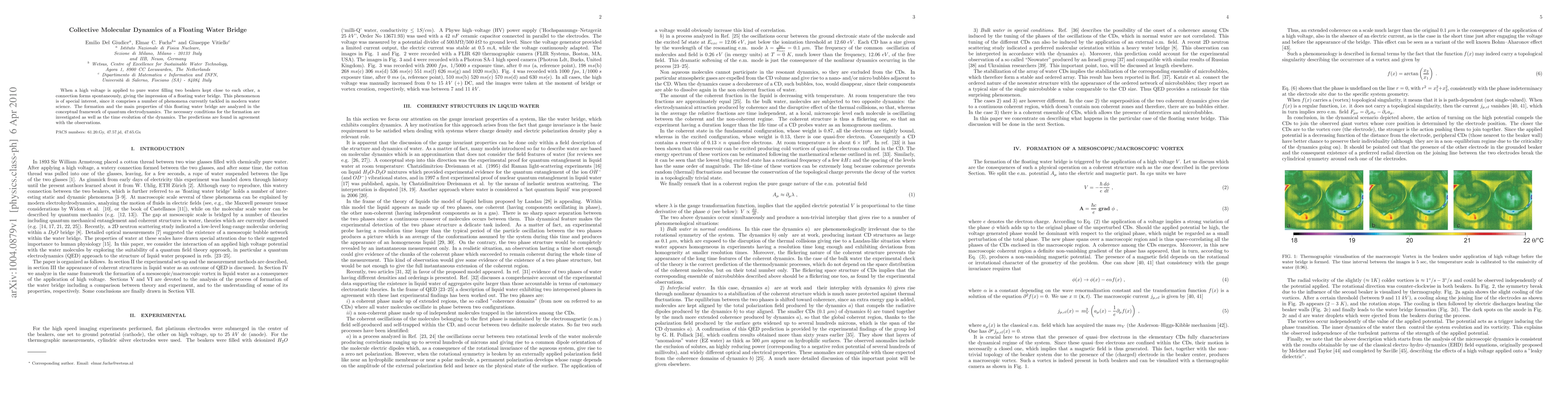 When a high voltage is applied to pure water filling two beakers kept close to each other, a connection forms spontaneously, giving the impression of a floating water bridge. This phenomenon is of special interest, since it comprises a number of phenomena currently tackled in modern water science. The formation and the main properties of this floating water bridge are analyzed in the conceptual framework of quantum electrodynamics. The necessary conditions for the formation are investigated as well as the time evolution of the dynamics. The predictions are found in agreement with the observations.