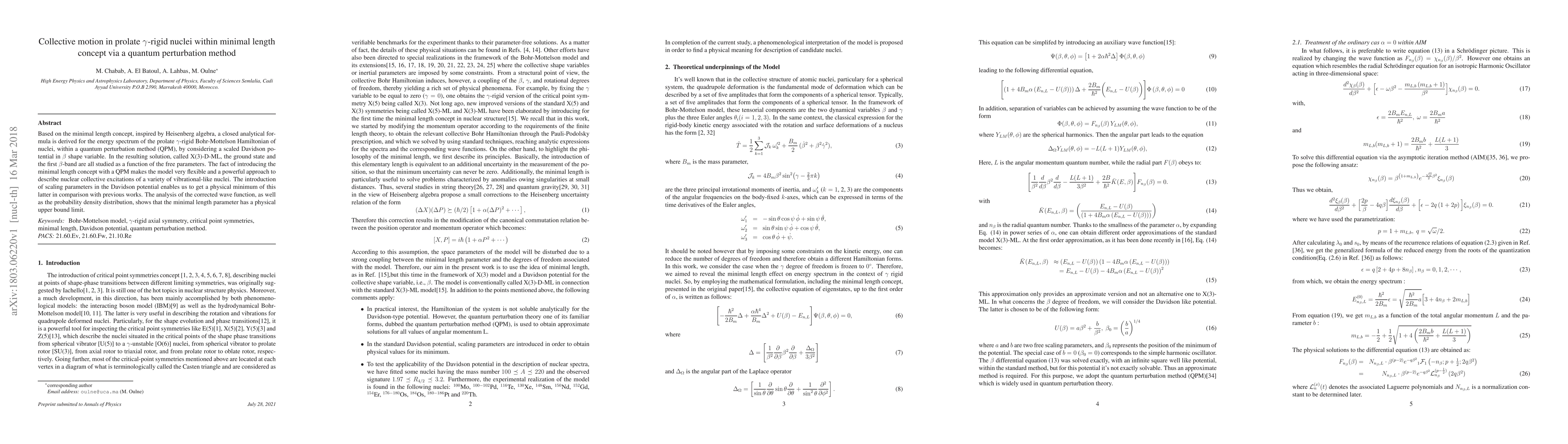 This paper derives an analytical formula for the energy spectrum of prolate γ-rigid nuclei using a quantum perturbation method, incorporating the minimal length concept inspired by Heisenberg algebra. The study reveals a flexible and powerful approach to describe nuclear collective excitations, with the introduction of scaling parameters in the Davidson potential providing a physical minimum.