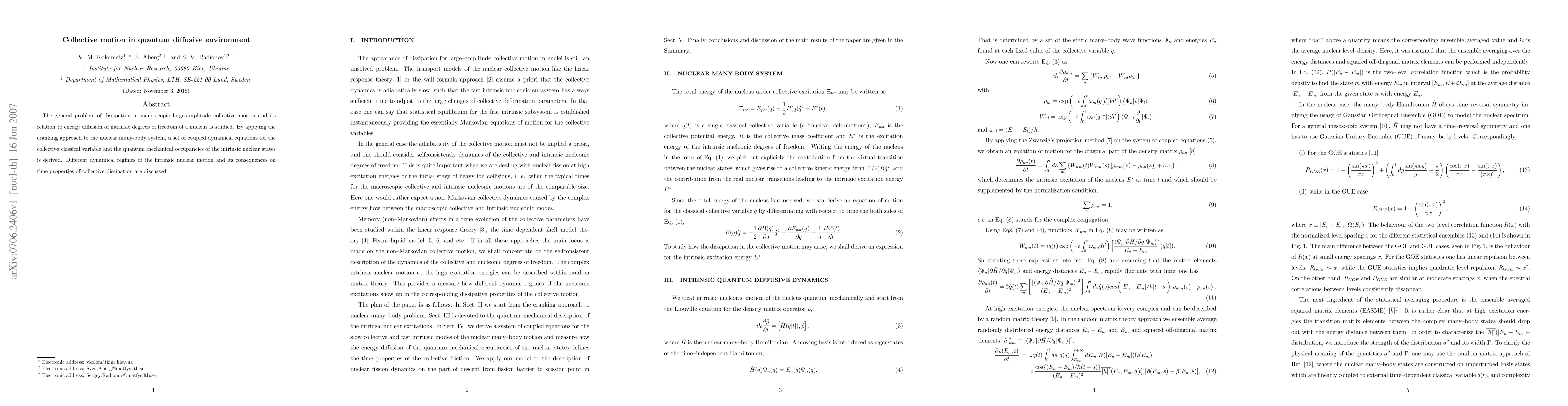 This paper investigates the dissipation in large-scale collective motion in nuclei, applying the cranking approach to derive coupled equations for classical and quantum dynamics. It explores various dynamical regimes and their impact on the time-dependent properties of collective dissipation.