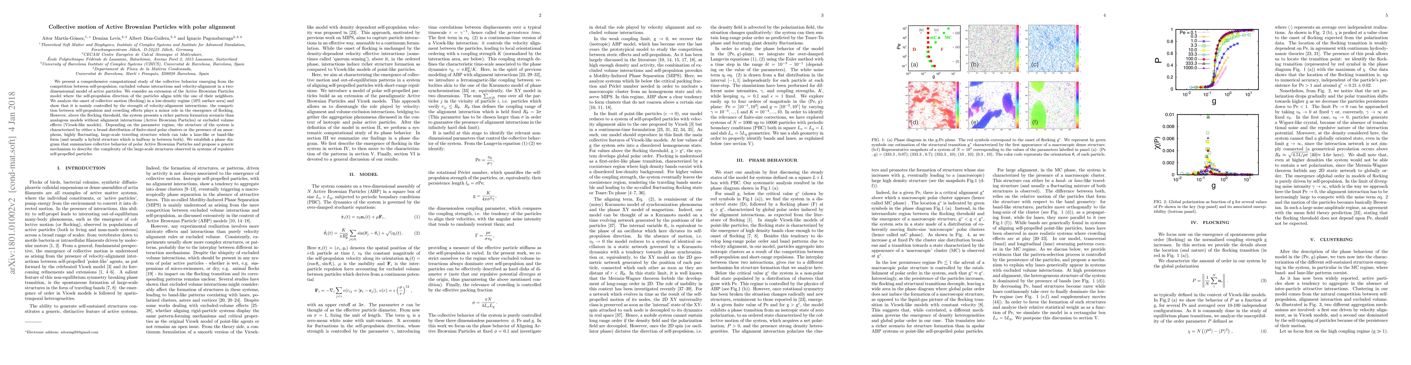 We present a comprehensive computational study of the collective behavior emerging from the competition between self-propulsion, excluded volume interactions and velocity-alignment in a two-dimensionnal model of active particles. We consider an extension of the Active Brownian Particles model where the self-propulsion direction of the particles aligns with the one of their neighbors. We analyze the onset of collective motion (flocking) in a low-density regime (10% surface area) and show that it is mainly controlled by the strength of velocity-alignment interactions: the competition between self-propulsion and crowding effects plays a minor role in the emergence of flocking. However, above the flocking threshold, the system presents a richer pattern formation scenario than analogous models without alignment interactions (Active Brownian Particles) or excluded volume effects (Vicsek-like models). Depending on the parameter regime, the structure of the system is characterized by either a broad distribution of finite-sized polar clusters or the presence of an amorphous, highly fluctuating, large-scale traveling structure which can take a lane-like or band-like form (and usually a hybrid structure which is halfway in between both). We establish a phase diagram that summarizes collective behavior of polar Active Brownian Particles and propose a generic mechanism to describe the complexity of the large-scale structures observed in systems of repulsive self-propelled particles.