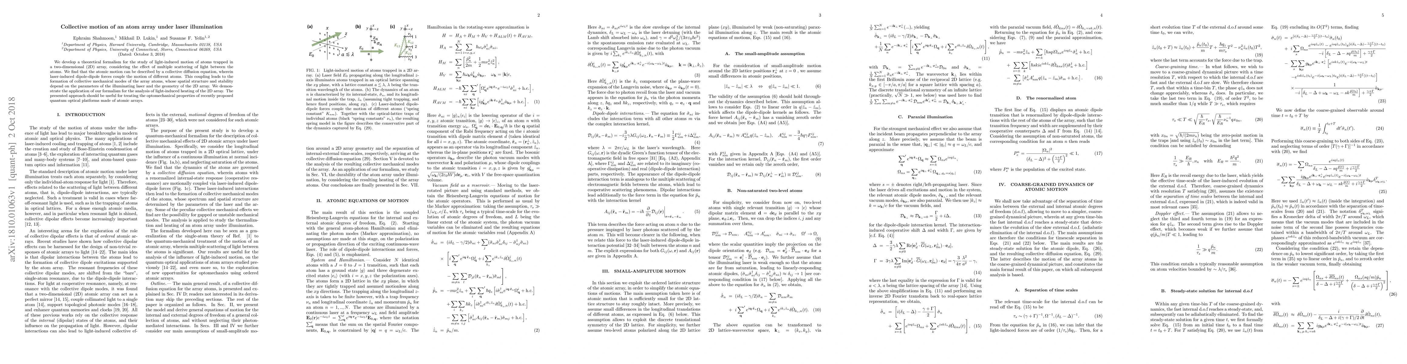 We develop a theoretical formalism for the study of light-induced motion of atoms trapped in a two-dimensional (2D) array, considering the effect of multiple scattering of light between the atoms. We find that the atomic motion can be described by a collective diffusion equation, wherein laser-induced dipole-dipole forces couple the motion of different atoms. This coupling leads to the formation of collective mechanical modes of the array atoms, whose spatial structure and stability depend on the parameters of the illuminating laser and the geometry of the 2D array. We demonstrate the application of our formalism for the analysis of light-induced heating of the 2D array. The presented approach should be useful for treating the optomechanical properties of recently proposed quantum optical platforms made of atomic arrays.