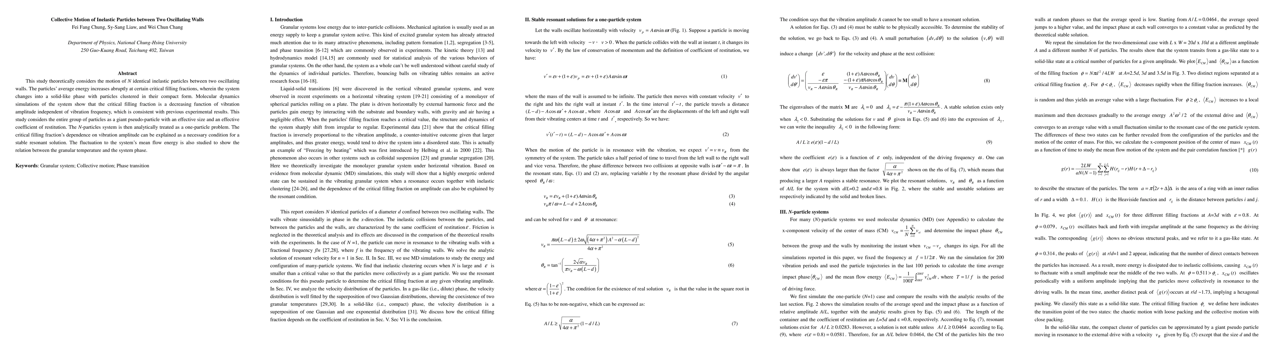 This study theoretically considers the motion of N identical inelastic particles between two oscillating walls. The particles' average energy increases abruptly at certain critical filling fractions, wherein the system changes into a solid-like phase with particles clustered in their compact form. Molecular dynamics simulations of the system show that the critical filling fraction is a decreasing function of vibration amplitude independent of vibration frequency, which is consistent with previous experimental results. This study considers the entire group of particles as a giant pseudo-particle with an effective size and an effective coefficient of restitution. The N-particles system is then analytically treated as a one-particle problem. The critical filling fraction's dependence on vibration amplitude can be explained as a necessary condition for a stable resonant solution. The fluctuation to the system's mean flow energy is also studied to show the relation between the granular temperature and the system phase.