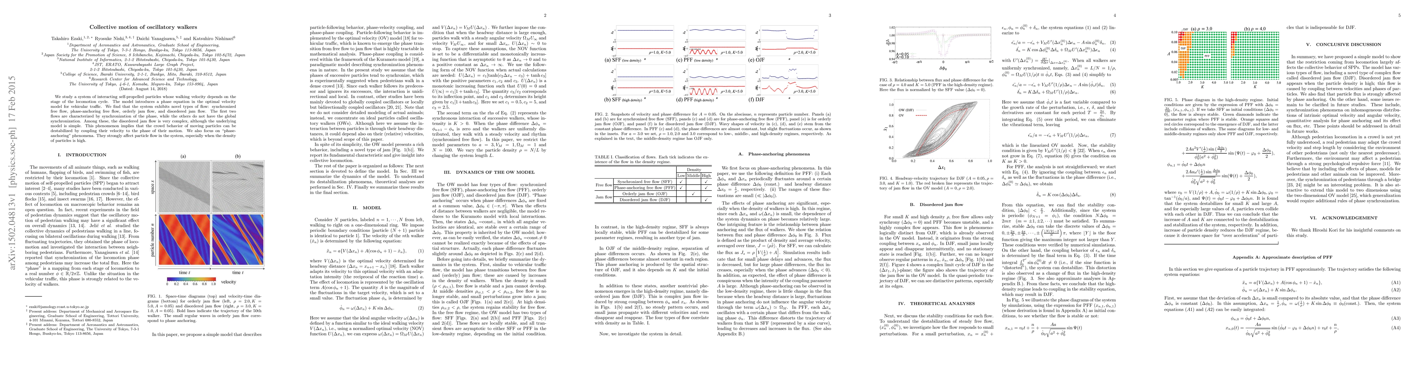 We study a system of interacting self-propelled particles whose walking velocity depends on the stage of the locomotion cycle. The model introduces a phase equation in the optimal velocity model for vehicular traffic. We find that the system exhibits novel types of flow: synchronized free flow, phase-anchoring free flow, orderly jam flow, and disordered jam flow. The first two flows are characterized by synchronization of the phase, while the others do not have the global synchronization. Among these, the disordered jam flow is very complex, although the underlying model is simple. This phenomenon implies that the crowd behavior of moving particles can be destabilized by coupling their velocity to the phase of their motion. We also focus on "phase-anchoring" phenomena. They strongly affect particle flow in the system, especially when the density of particles is high.