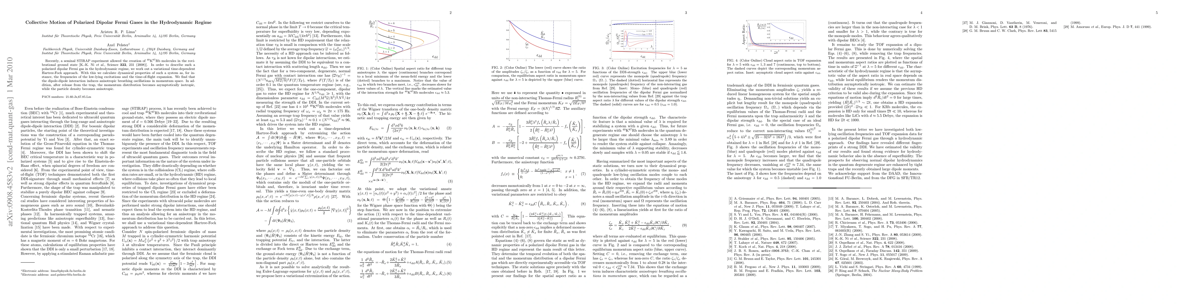 Recently, a seminal STIRAP experiment allowed the creation of 40K-87Rb molecules in the rovibrational ground state [K.-K. Ni et al., Science 322, 231 (2008)]. In order to describe such a polarized dipolar Fermi gas in the hydrodynamic regime, we work out a variational time-dependent Hartree-Fock approach. With this we calculate dynamical properties of such a system as, for instance, the frequencies of the low-lying excitations and the time-of-flight expansion. We find that the dipole-dipole interaction induces anisotropic breathing oscillations in momentum space. In addition, after release from the trap, the momentum distribution becomes asymptotically isotropic, while the particle density becomes anisotropic.