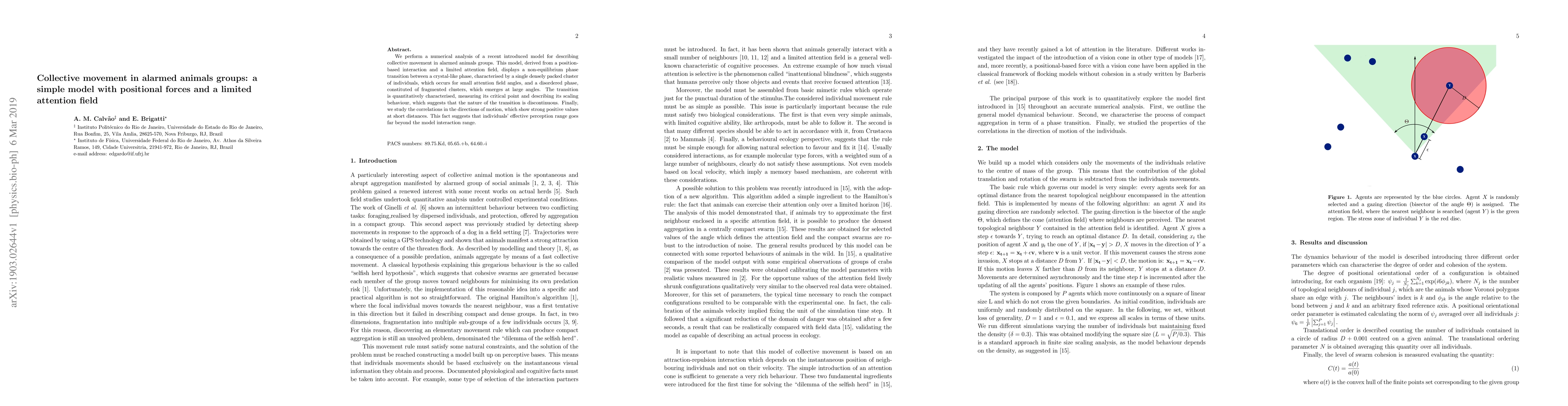 We perform a numerical analysis of a recent introduced model for describing collective movement in alarmed animals groups. This model, derived from a position-based interaction and a limited attention field, displays a non-equilibrium phase transition between a crystal-like phase, characterised by a single densely packed cluster of individuals, which occurs for small attention field angles, and a disordered phase, constituted of fragmented clusters, which emerges at large angles. The transition is quantitatively characterised, measuring its critical point and describing its scaling behaviour, which suggests that the nature of the transition is discontinuous. Finally, we study the correlations in the directions of motion, which show strong positive values at short distances. This fact suggests that individuals' effective perception range goes far beyond the model interaction range.