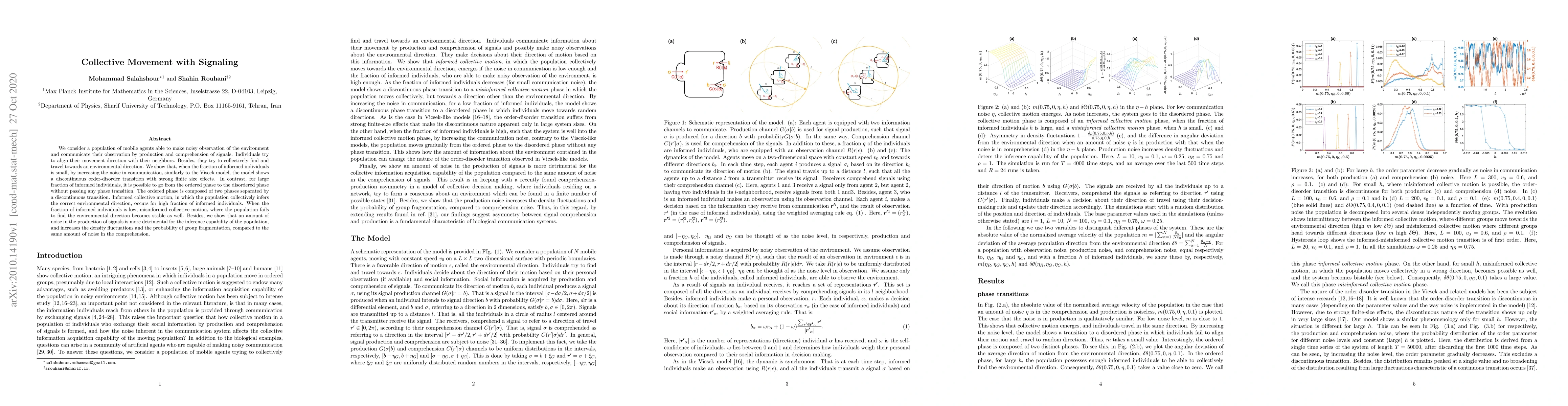 We consider a population of mobile agents able to make noisy observation of the environment and communicate their observation by production and comprehension of signals. Individuals try to align their movement direction with their neighbors. Besides, they try to collectively find and travel towards an environmental direction. We show that, when the fraction of informed individuals is small, by increasing the noise in communication, similarly to the Viscek model, the model shows a discontinuous order-disorder transition with strong finite size effects. In contrast, for large fraction of informed individuals, it is possible to go from the ordered phase to the disordered phase without passing any phase transition. The ordered phase is composed of two phases separated by a discontinuous transition. Informed collective motion, in which the population collectively infers the correct environmental direction, occurs for high fraction of informed individuals. When the fraction of informed individuals is low, misinformed collective motion, where the population fails to find the environmental direction becomes stable as well. Besides, we show that an amount of noise in the production of signals is more detrimental for the inference capability of the population, and increases the density fluctuations and the probability of group fragmentation, compared to the same amount of noise in the comprehension.