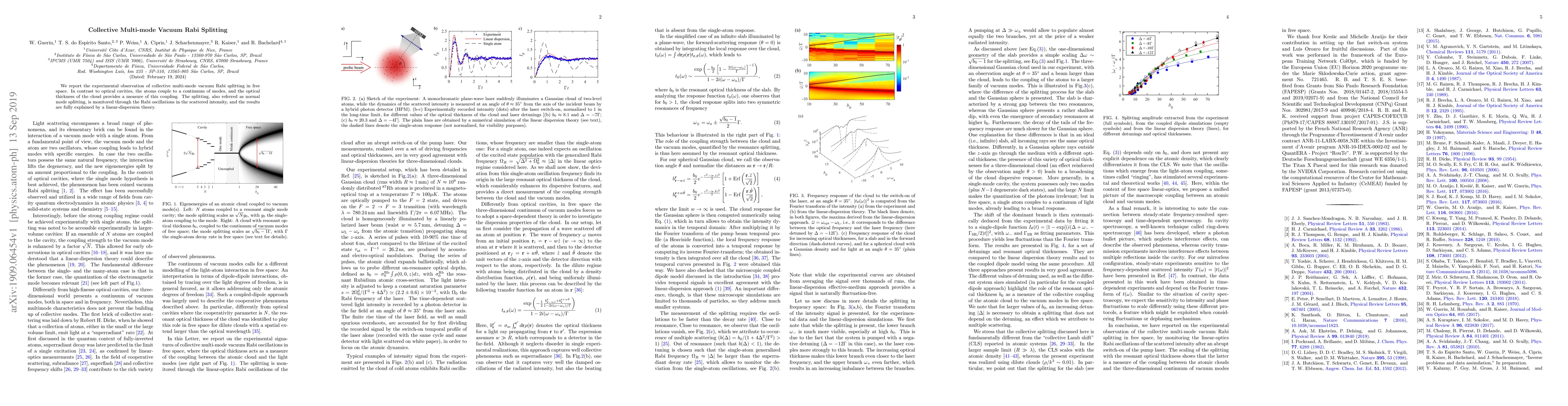 This paper reports the experimental observation of collective multi-mode vacuum Rabi splitting in free space, where atoms interact with a continuum of modes, and the optical thickness of the cloud measures this coupling. The phenomenon is monitored via Rabi oscillations in scattered intensity, with results explained by a linear-dispersion theory.