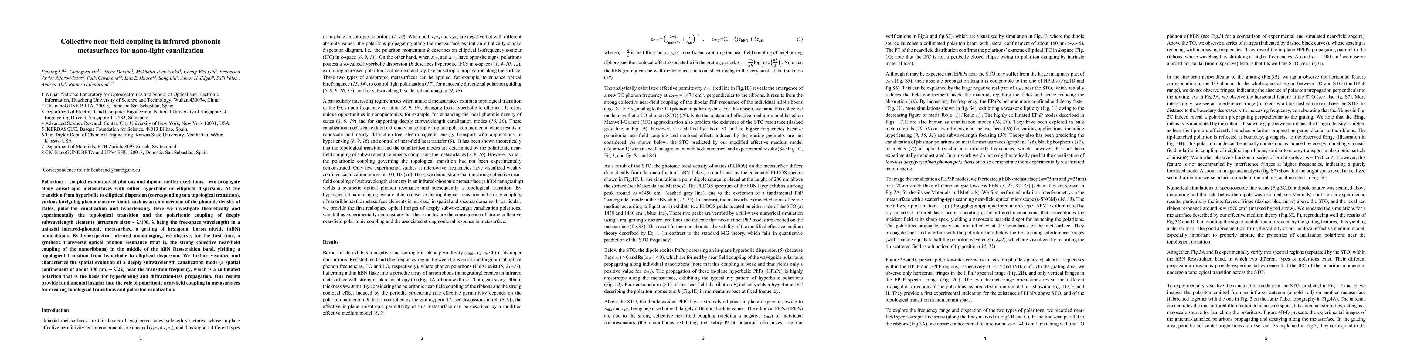 This paper investigates theoretically and experimentally the topological transition in infrared-phononic metasurfaces, specifically a hexagonal boron nitride (hBN) grating, leading to collective near-field coupling and polariton canalization. The study reveals a synthetic transverse optical phonon resonance via hyperspectral infrared nanoimaging, demonstrating a transition from hyperbolic to elliptical dispersion.