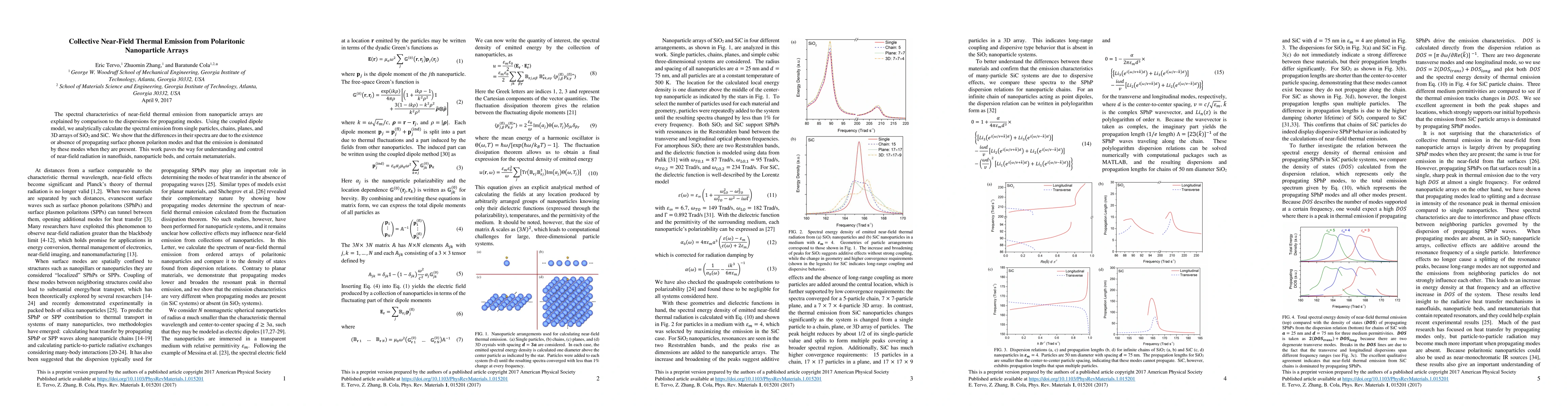 The spectral characteristics of near-field thermal emission from nanoparticle arrays are explained by comparison to the dispersions for propagating modes. Using the coupled dipole model, we analytically calculate the spectral emission from single particles, chains, planes, and 3D arrays of SiO2 and SiC. We show that the differences in their spectra are due to the existence or absence of propagating surface phonon polariton modes and that the emission is dominated by these modes when they are present. This work paves the way for understanding and control of near-field radiation in nanofluids, nanoparticle beds, and certain metamaterials.