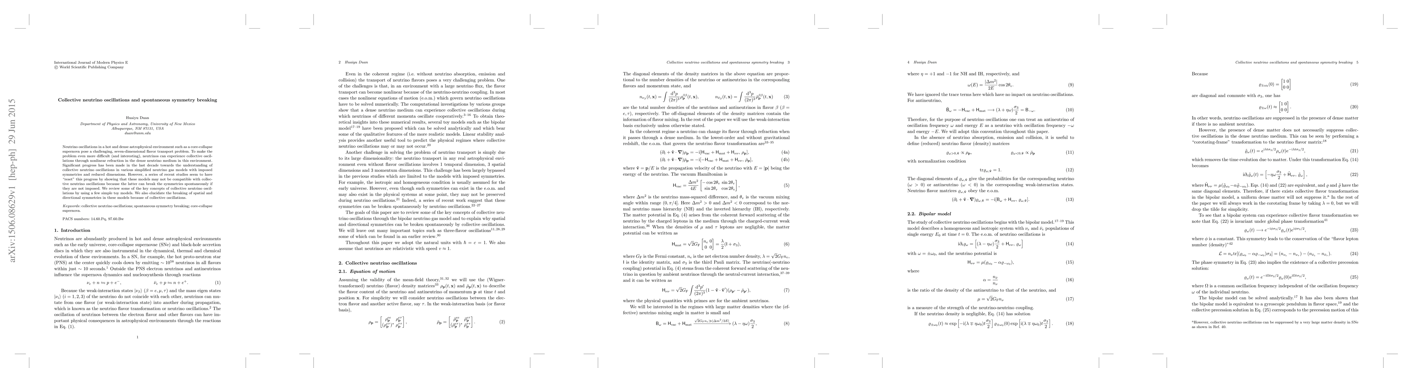 This paper reviews collective neutrino oscillations in dense astrophysical environments, highlighting the complexities introduced by spontaneous symmetry breaking. It uses simplified models to demonstrate how collective oscillations can disrupt imposed symmetries, challenging previous progress in understanding these phenomena.