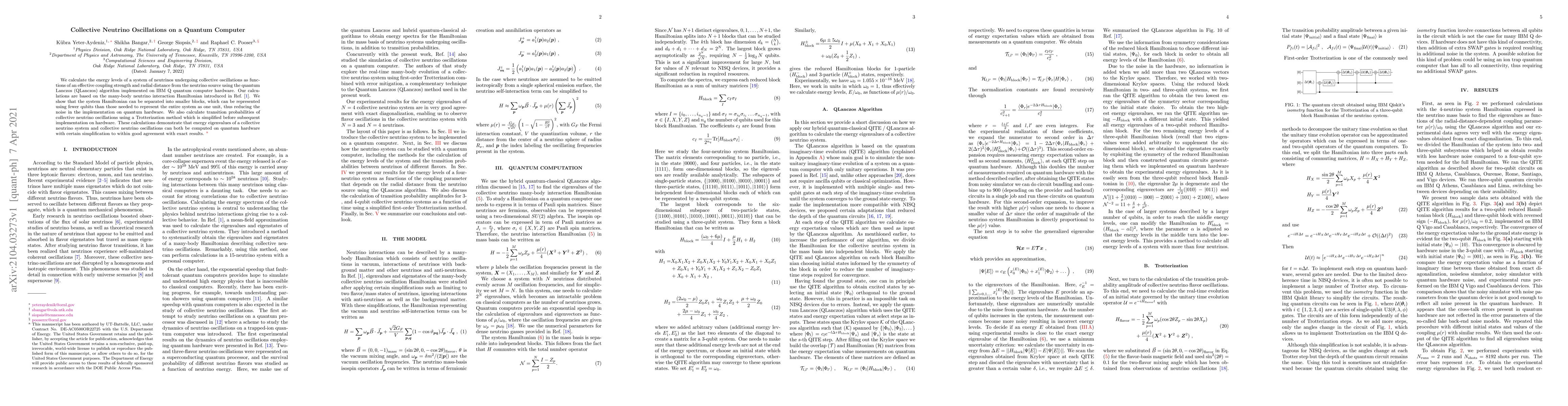 We calculate the energy levels of a system of neutrinos undergoing collective oscillations as functions of an effective coupling strength and radial distance from the neutrino source using the quantum Lanczos (QLanczos) algorithm implemented on IBM Q quantum computer hardware. Our calculations are based on the many-body neutrino interaction Hamiltonian introduced in Ref.\ \cite{Patwardhan2019}. We show that the system Hamiltonian can be separated into smaller blocks, which can be represented using fewer qubits than those needed to represent the entire system as one unit, thus reducing the noise in the implementation on quantum hardware. We also calculate transition probabilities of collective neutrino oscillations using a Trotterization method which is simplified before subsequent implementation on hardware. These calculations demonstrate that energy eigenvalues of a collective neutrino system and collective neutrino oscillations can both be computed on quantum hardware with certain simplification to within good agreement with exact results.