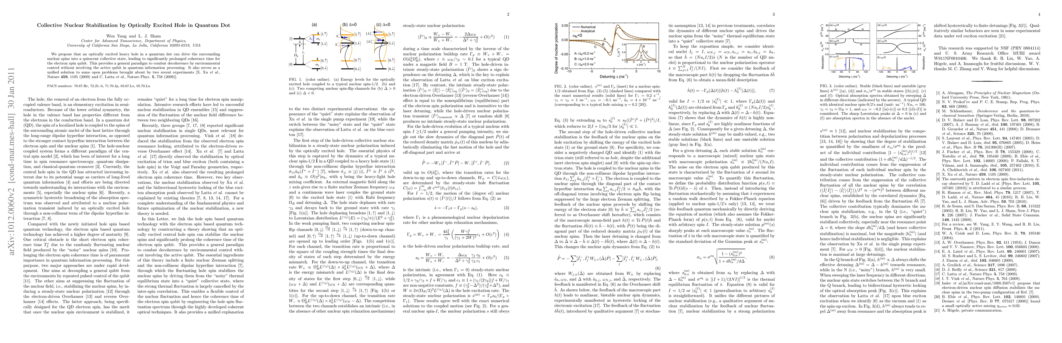 This paper proposes a method where an optically excited heavy hole in a quantum dot stabilizes surrounding nuclear spins, enhancing electron spin qubit coherence time. This approach offers a passive decoherence mitigation strategy without involving the active qubit in quantum information processing.
