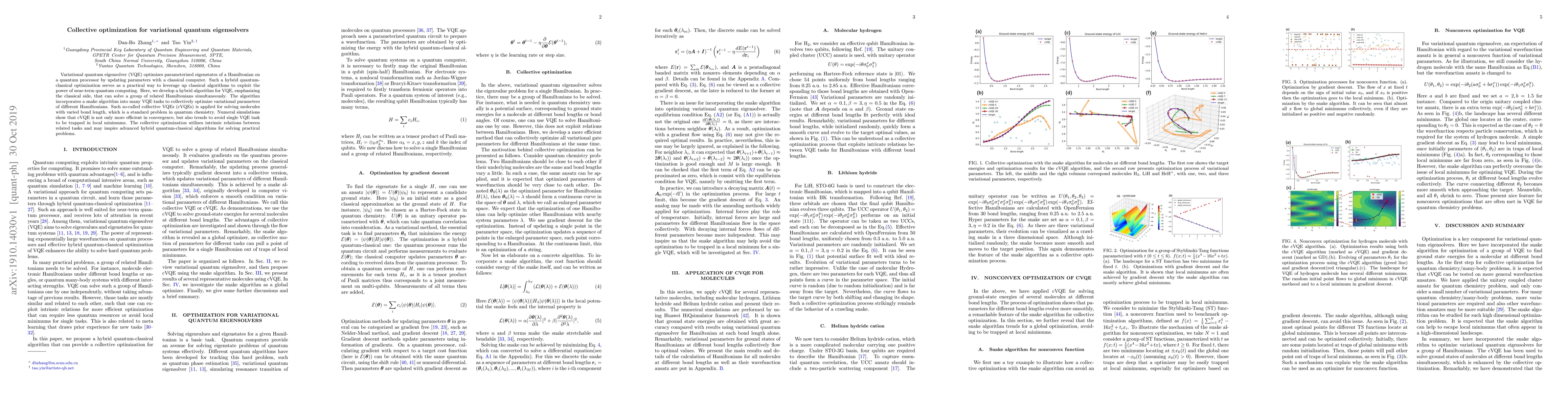 This paper proposes a collective optimization algorithm for variational quantum eigensolvers (VQE) that simultaneously solves a group of related Hamiltonians using a hybrid quantum-classical approach. The developed algorithm, called collective VQE (cVQE), leverages the intrinsic relations between tasks to improve convergence efficiency and avoid local minima, demonstrating its effectiveness through simulations on quantum chemistry problems.