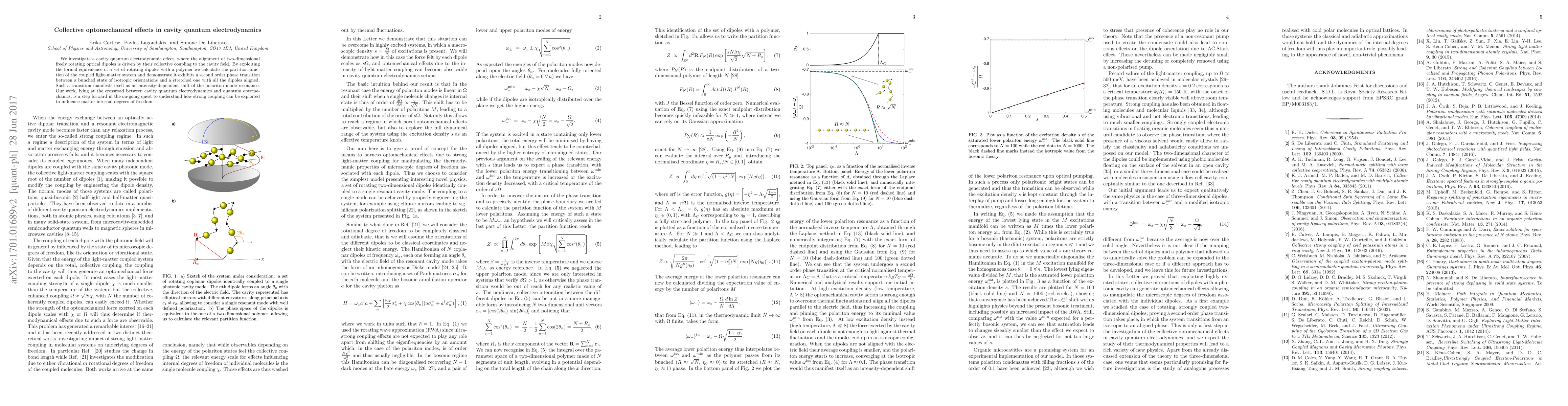 This paper explores collective optomechanical effects in cavity quantum electrodynamics, revealing a phase transition in the alignment of optical dipoles driven by their coupling to a cavity field. The transition manifests as an intensity-dependent shift in the polariton mode resonance, highlighting the potential of strong coupling to influence matter's internal degrees of freedom.