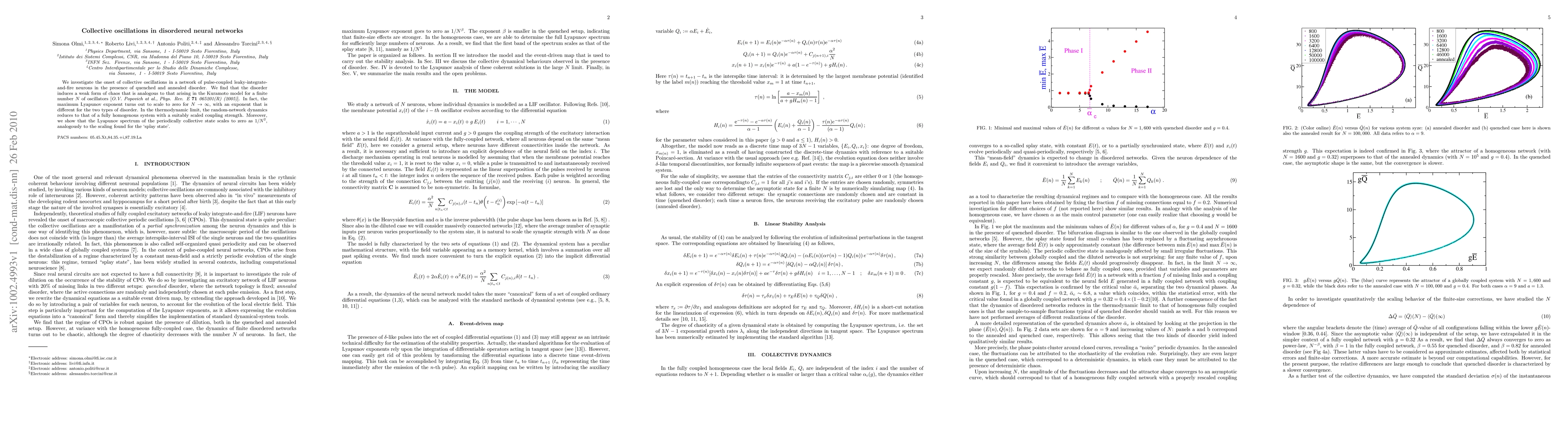 We investigate the onset of collective oscillations in a network of pulse-coupled leaky-integrate-and-fire neurons in the presence of quenched and annealed disorder. We find that the disorder induces a weak form of chaos that is analogous to that arising in the Kuramoto model for a finite number N of oscillators [O.V. Popovych at al., Phys. Rev. E 71} 065201(R) (2005)]. In fact, the maximum Lyapunov exponent turns out to scale to zero for N going to infinite, with an exponent that is different for the two types of disorder. In the thermodynamic limit, the random-network dynamics reduces to that of a fully homogenous system with a suitably scaled coupling strength. Moreover, we show that the Lyapunov spectrum of the periodically collective state scales to zero as 1/N^2, analogously to the scaling found for the `splay state'.
