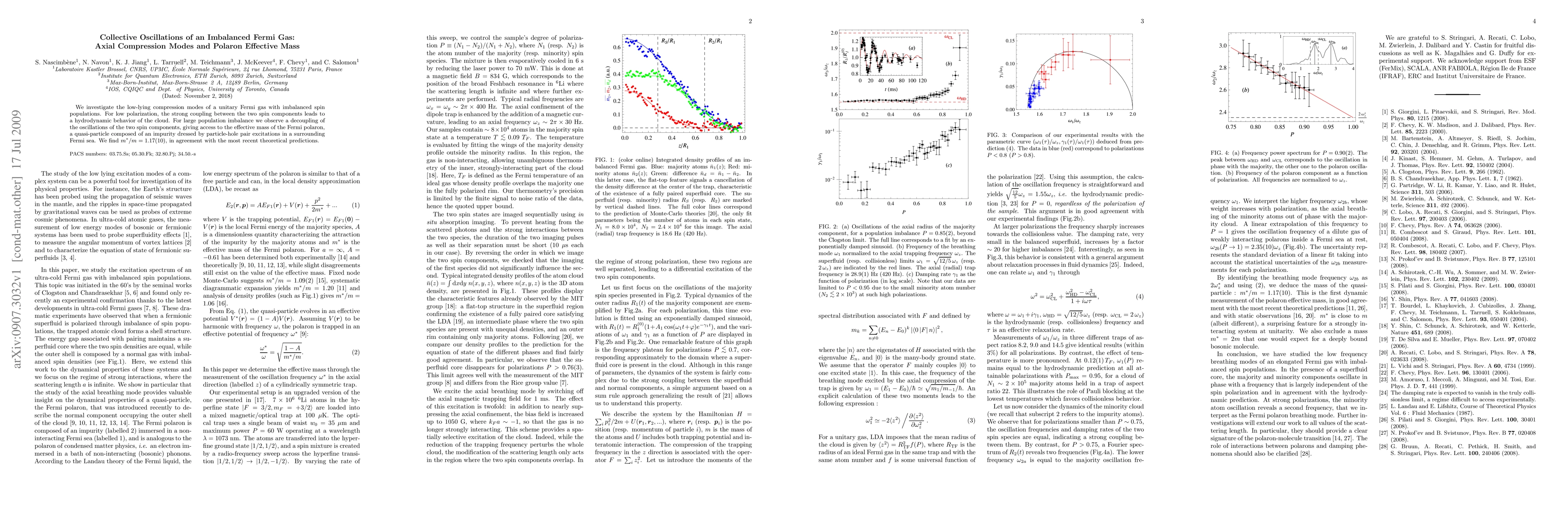 This paper examines the low-lying compression modes of an imbalanced Fermi gas, revealing hydrodynamic behavior at low polarization and decoupling of oscillations at high imbalance, allowing measurement of the Fermi polaron's effective mass, which aligns with theoretical predictions at $m^*/m=1.17(10)$.