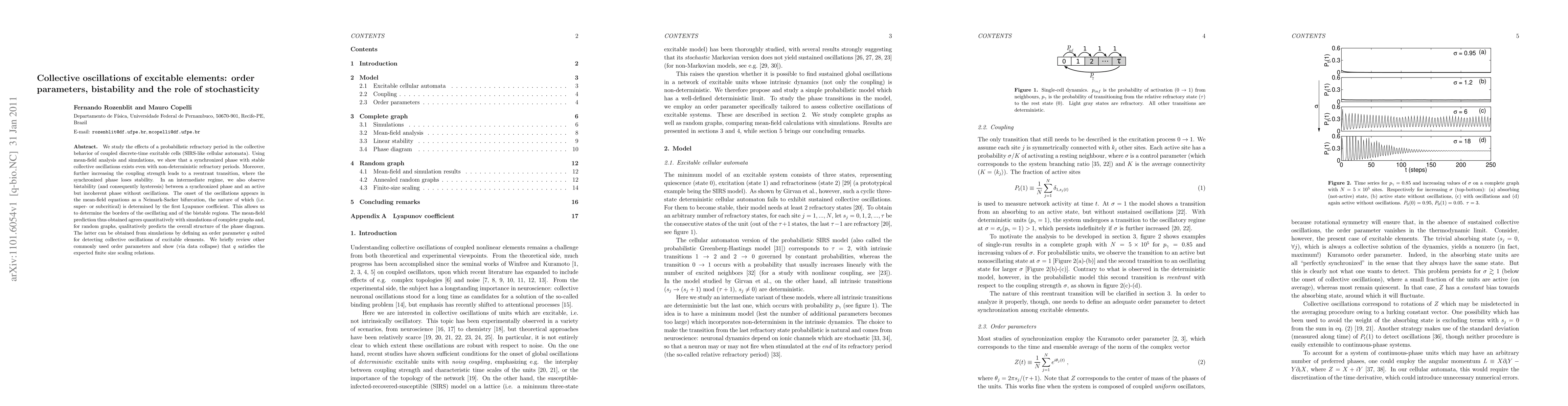 We study the effects of a probabilistic refractory period in the collective behavior of coupled discrete-time excitable cells (SIRS-like cellular automata). Using mean-field analysis and simulations, we show that a synchronized phase with stable collective oscillations exists even with non-deterministic refractory periods. Moreover, further increasing the coupling strength leads to a reentrant transition, where the synchronized phase loses stability. In an intermediate regime, we also observe bistability (and consequently hysteresis) between a synchronized phase and an active but incoherent phase without oscillations. The onset of the oscillations appears in the mean-field equations as a Neimark-Sacker bifurcation, the nature of which (i.e. super- or subcritical) is determined by the first Lyapunov coefficient. This allows us to determine the borders of the oscillating and of the bistable regions. The mean-field prediction thus obtained agrees quantitatively with simulations of complete graphs and, for random graphs, qualitatively predicts the overall structure of the phase diagram. The latter can be obtained from simulations by defining an order parameter q suited for detecting collective oscillations of excitable elements. We briefly review other commonly used order parameters and show (via data collapse) that q satisfies the expected finite size scaling relations.