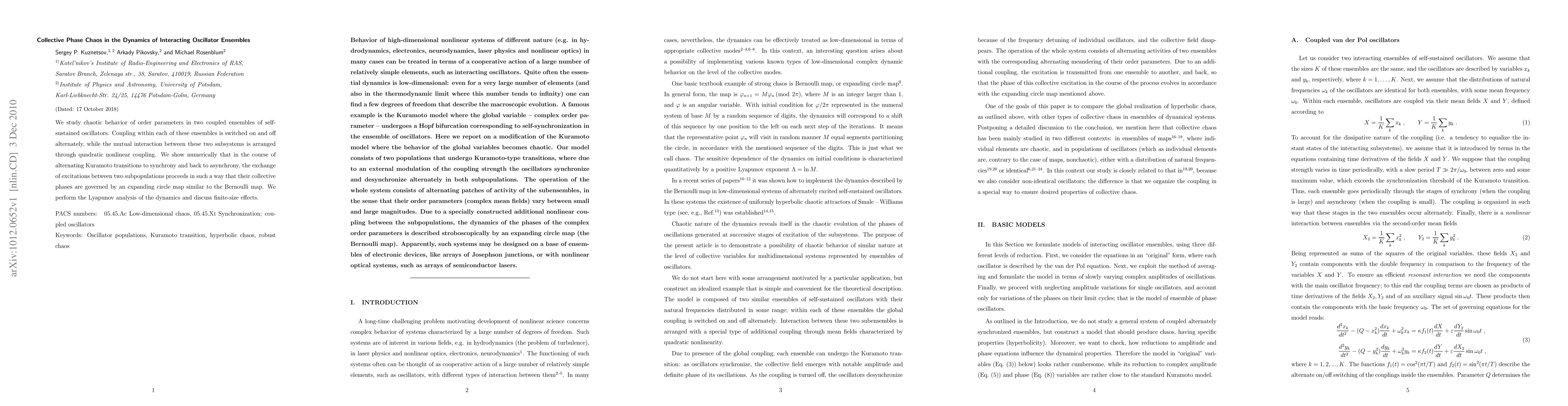 This paper investigates chaotic dynamics in coupled ensembles of self-sustained oscillators, revealing that alternating Kuramoto transitions lead to collective phase behavior governed by an expanding circle map. The study also includes a Lyapunov analysis and examines finite-size effects.