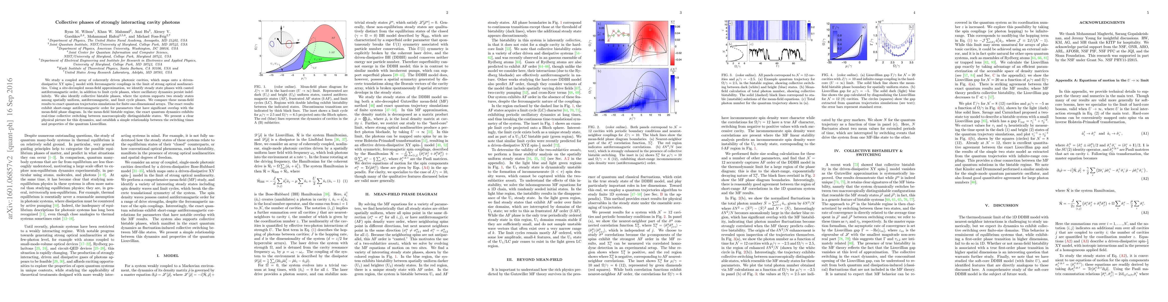 We study a coupled array of coherently driven photonic cavities, which maps onto a driven-dissipative XY spin-$\frac{1}{2}$ model with ferromagnetic couplings in the limit of strong optical nonlinearities. Using a site-decoupled mean-field approximation, we identify steady state phases with canted antiferromagnetic order, in addition to limit cycle phases, where oscillatory dynamics persist indefinitely. We also identify collective bistable phases, where the system supports two steady states among spatially uniform, antiferromagnetic, and limit cycle phases. We compare these mean-field results to exact quantum trajectories simulations for finite one-dimensional arrays. The exact results exhibit short-range antiferromagnetic order for parameters that have significant overlap with the mean-field phase diagram. In the mean-field bistable regime, the exact quantum dynamics exhibits real-time collective switching between macroscopically distinguishable states. We present a clear physical picture for this dynamics, and establish a simple relationship between the switching times and properties of the quantum Liouvillian.