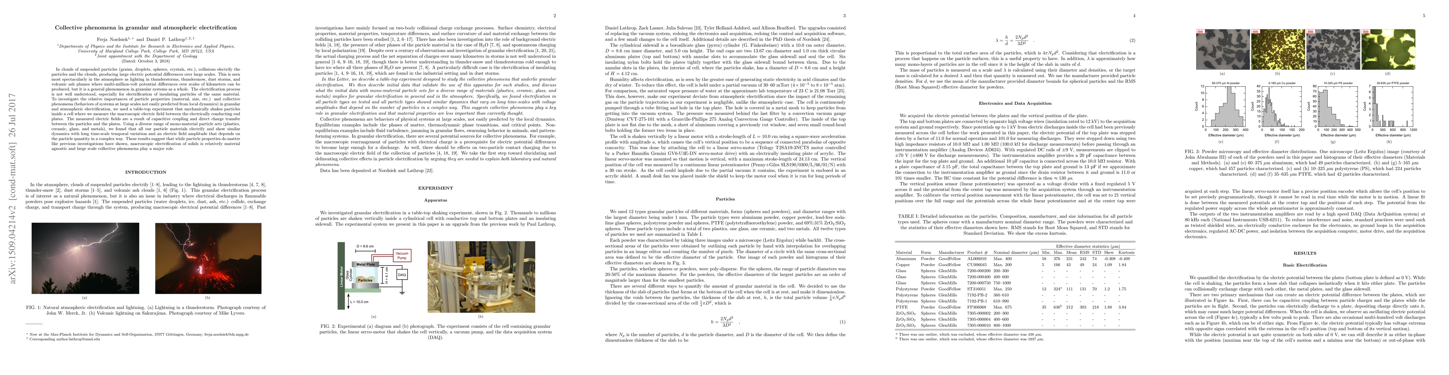 The research investigates the electrification of granular and atmospheric particles through collisions, revealing that macroscopic electric fields depend more on collective phenomena than on particle material properties. Experiments with various particle types showed similar electrification dynamics, suggesting that large-scale behaviors dominate over individual particle characteristics.