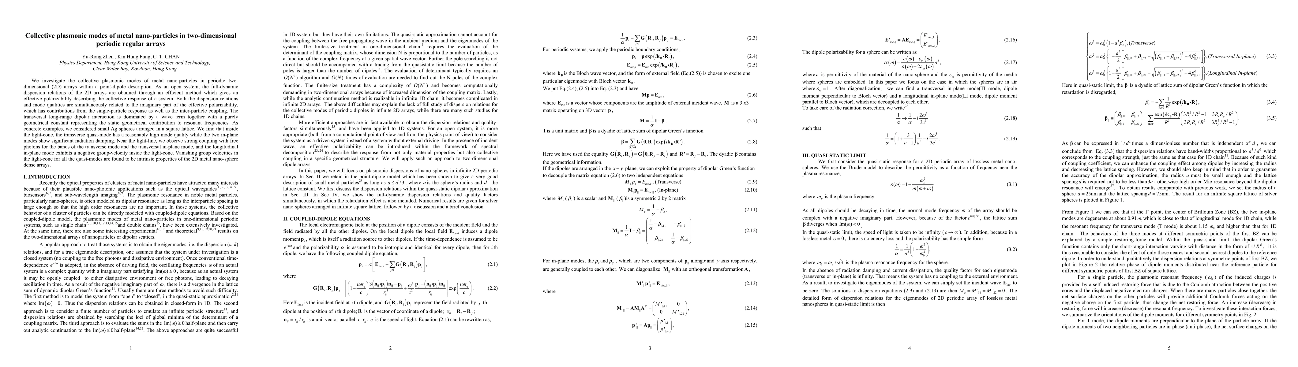 This paper investigates collective plasmonic modes in 2D arrays of metal nanoparticles, revealing high-quality transverse quasi-modes near the light-cone with strong coupling to free photons.
