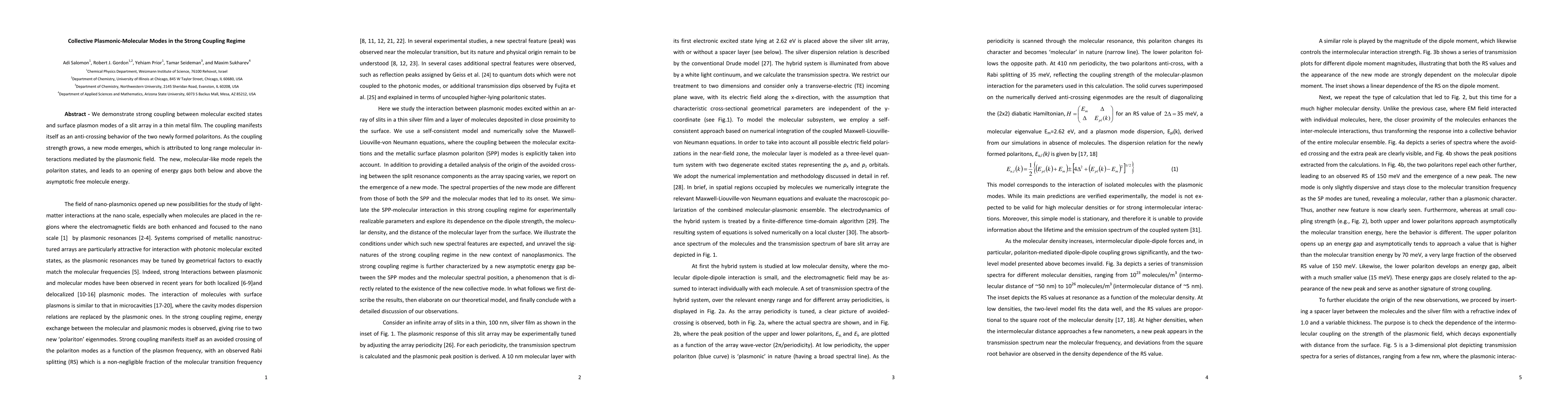 This paper demonstrates strong coupling between molecular excited states and surface plasmon modes in a thin metal film, resulting in anti-crossing polaritons and the emergence of a new molecular-like mode due to long-range interactions mediated by the plasmonic field, which opens energy gaps.