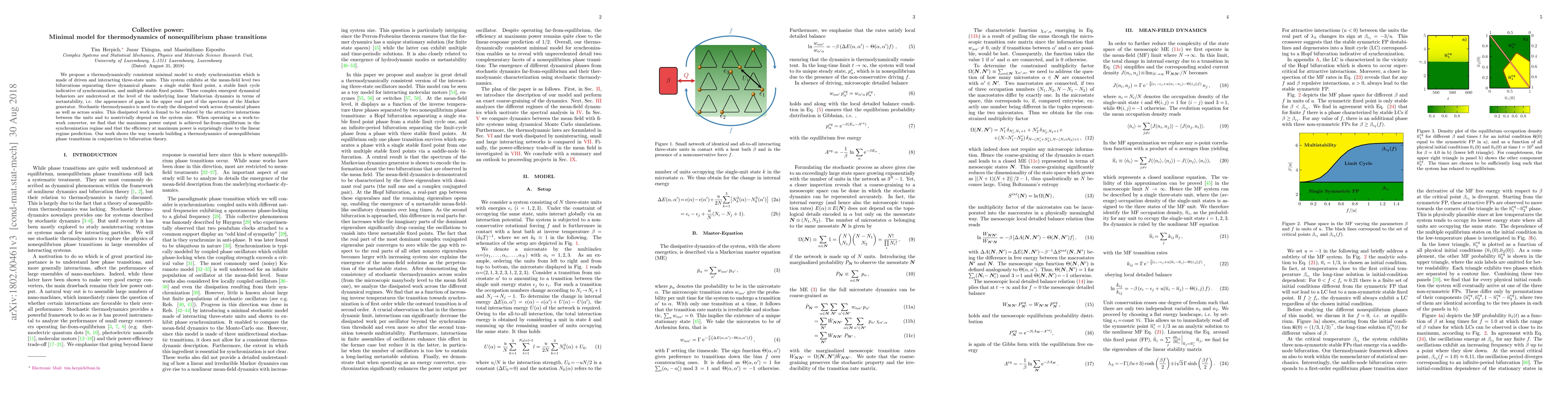We propose a thermodynamically consistent minimal model to study synchronization which is made of driven and interacting three-state units. This system exhibits at the mean-field level two bifurcations separating three dynamical phases: a single stable fixed point, a stable limit cycle indicative of synchronization, and multiple stable fixed points. These complex emergent dynamical behaviors are understood at the level of the underlying linear Markovian dynamics in terms of metastability, i.e. the appearance of gaps in the upper real part of the spectrum of the Markov generator. Stochastic thermodynamics is used to study the dissipated work across dynamical phases as well as across scales. This dissipated work is found to be reduced by the attractive interactions between the units and to nontrivially depend on the system size. When operating as a work-to-work converter, we find that the maximum power output is achieved far-from-equilibrium in the synchronization regime and that the efficiency at maximum power is surprisingly close to the linear regime prediction. Our work shows the way towards building a thermodynamics of nonequilibrium phase transitions in conjunction to bifurcation theory.