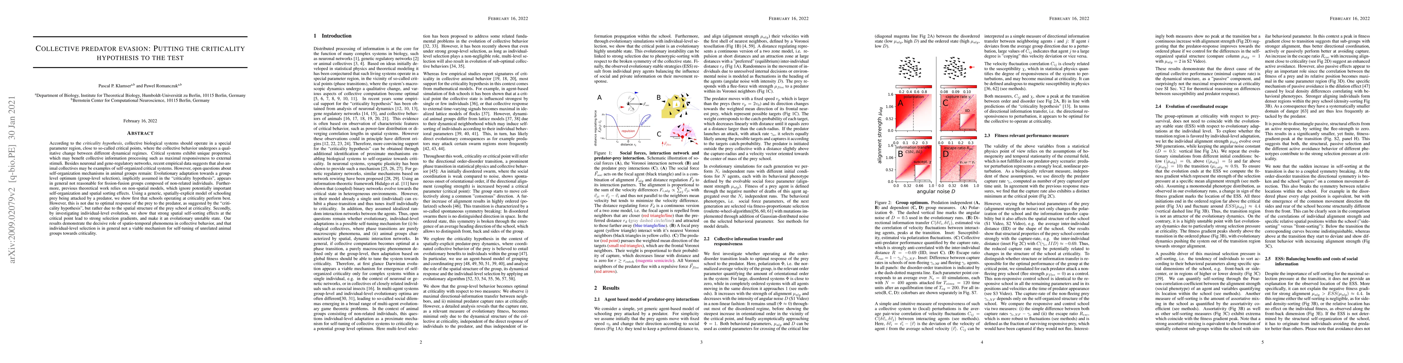 According to the criticality hypothesis, collective biological systems should operate in a special parameter region, close to so-called critical points, where the collective behavior undergoes a qualitative change between different dynamical regimes. Critical systems exhibit unique properties, which may benefit collective information processing such as maximal responsiveness to external stimuli. Besides neuronal and gene-regulatory networks, recent empirical data suggests that also animal collectives may be examples of self-organized critical systems. However, open questions about self-organization mechanisms in animal groups remain: Evolutionary adaptation towards a group-level optimum (group-level selection), implicitly assumed in the "criticality hypothesis", appears in general not reasonable for fission-fusion groups composed of non-related individuals. Furthermore, previous theoretical work relies on non-spatial models, which ignore potentially important self-organization and spatial sorting effects. Using a generic, spatially-explicit model of schooling prey being attacked by a predator, we show first that schools operating at criticality perform best. However, this is not due to optimal response of the prey to the predator, as suggested by the "criticality hypothesis", but rather due to the spatial structure of the prey school at criticality. Secondly, by investigating individual-level evolution, we show that strong spatial self-sorting effects at the critical point lead to strong selection gradients, and make it an evolutionary unstable state. Our results demonstrate the decisive role of spatio-temporal phenomena in collective behavior, and that individual-level selection is in general not a viable mechanism for self-tuning of unrelated animal groups towards criticality.