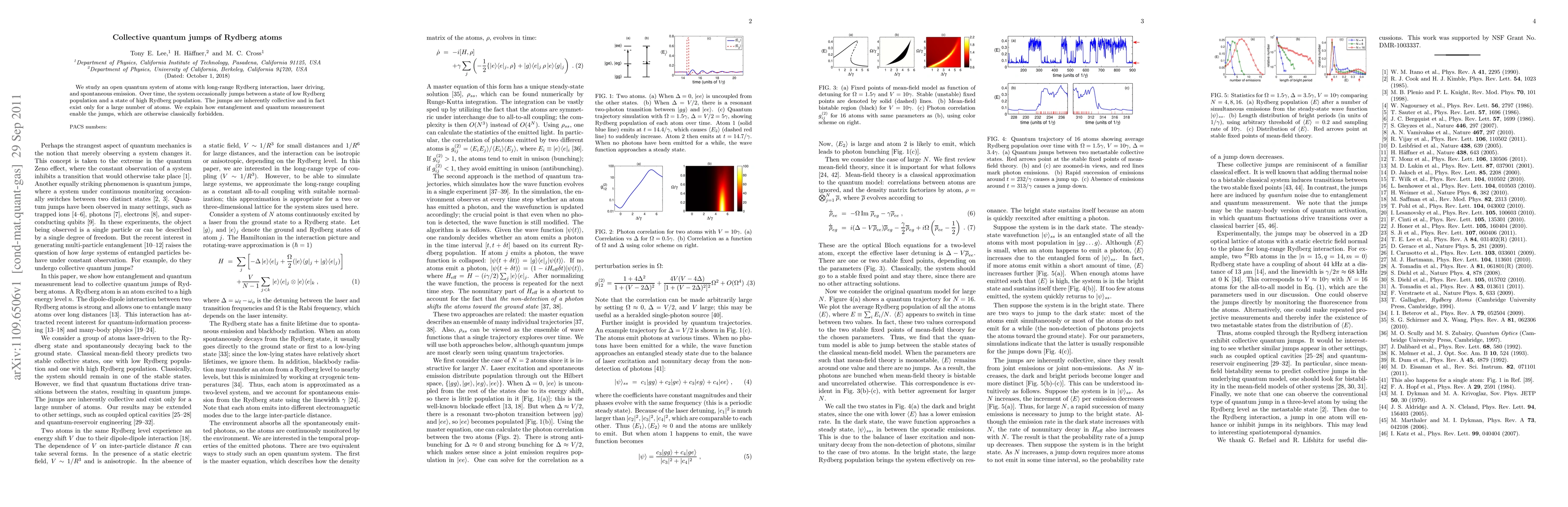 We study an open quantum system of atoms with long-range Rydberg interaction, laser driving, and spontaneous emission. Over time, the system occasionally jumps between a state of low Rydberg population and a state of high Rydberg population. The jumps are inherently collective and in fact exist only for a large number of atoms. We explain how entanglement and quantum measurement enable the jumps, which are otherwise classically forbidden.