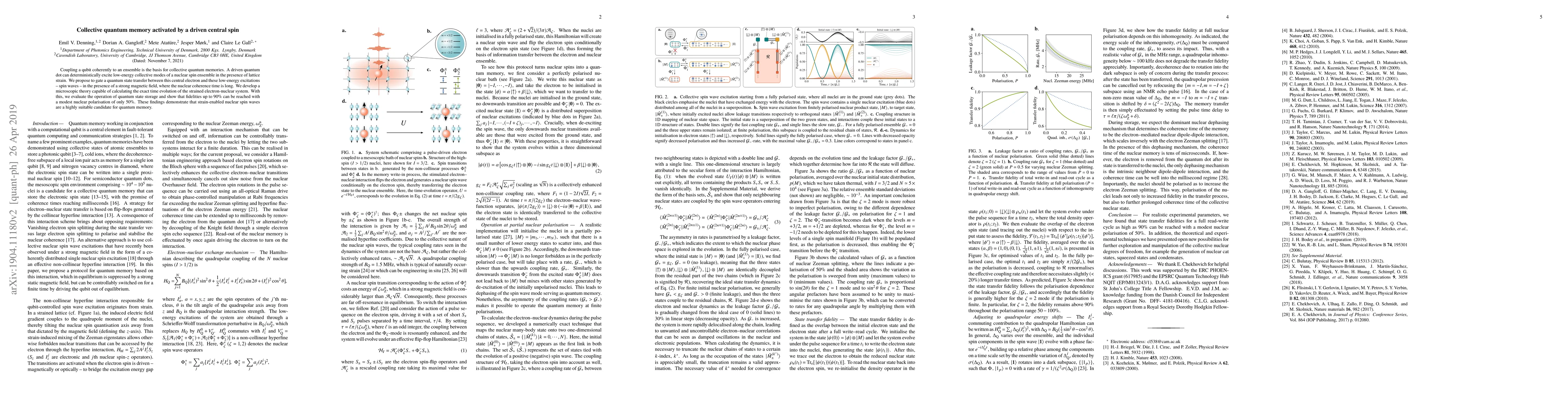 Coupling a qubit coherently to an ensemble is the basis for collective quantum memories. A driven quantum dot can deterministically excite low-energy collective modes of a nuclear spin ensemble in the presence of lattice strain. We propose to gate a quantum state transfer between this central electron and these low-energy excitations -- spin waves -- in the presence of a strong magnetic field, where the nuclear coherence time is long. We develop a microscopic theory capable of calculating the exact time evolution of the strained electron-nuclear system. With this, we evaluate the operation of quantum state storage and show that fidelities up to 90% can be reached with a modest nuclear polarisation of only 50%. These findings demonstrate that strain-enabled nuclear spin waves are a highly suitable candidate for quantum memory.