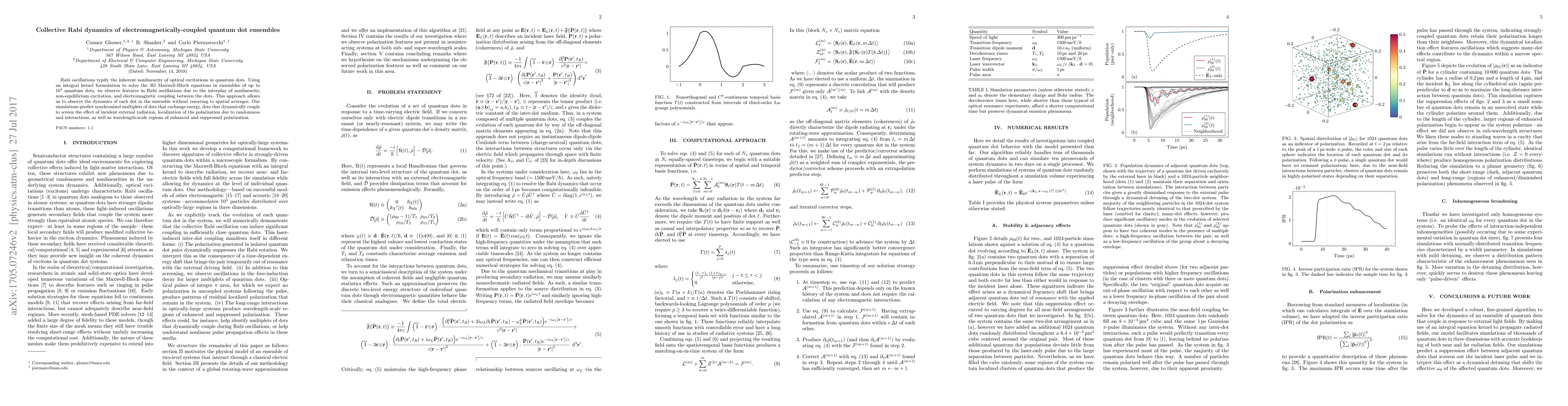 Rabi oscillations typify the inherent nonlinearity of optical excitations in quantum dots. Using an integral kernel formulation to solve the 3D Maxwell-Bloch equations in ensembles of up to $10^4$ quantum dots, we observe features in Rabi oscillations due to the interplay of nonlinearity, non-equilibrium excitation, and electromagnetic coupling between the dots. This approach allows us to observe the dynamics of each dot in the ensemble without resorting to spatial averages. Our simulations predict synchronized multiplets of dots that exchange energy, dots that dynamically couple to screen the effect of incident external radiation, localization of the polarization due to randomness and interactions, as well as wavelength-scale regions of enhanced and suppressed polarization.