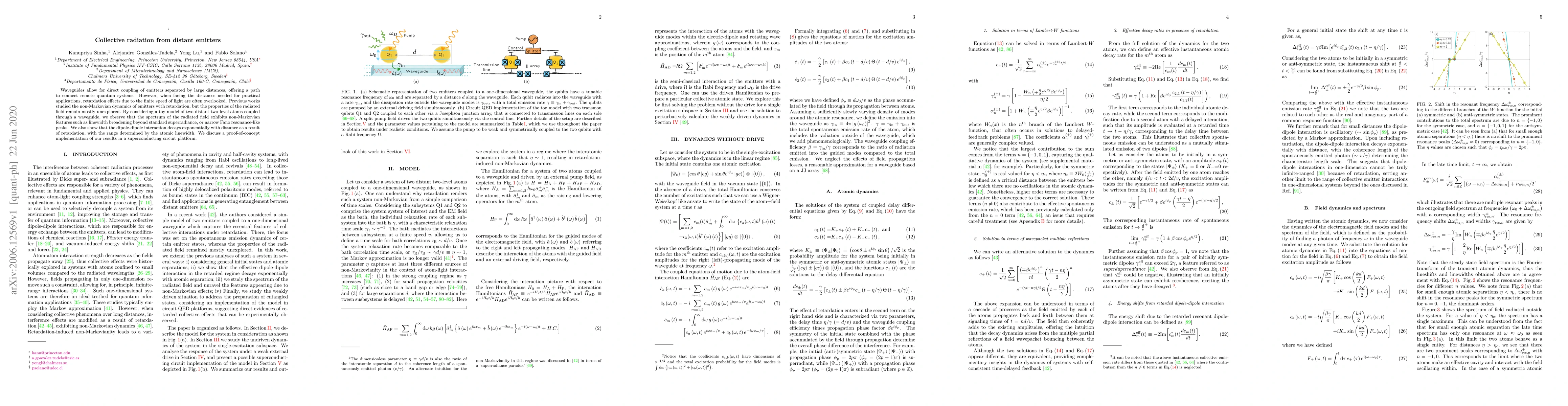 This paper investigates the collective radiation from distant emitters coupled via waveguides, revealing non-Markovian features in the radiated field spectrum due to retardation effects. It demonstrates the exponential decay of dipole-dipole interactions with distance, influenced by the atomic linewidth, and proposes a superconducting circuit for proof-of-concept implementation.