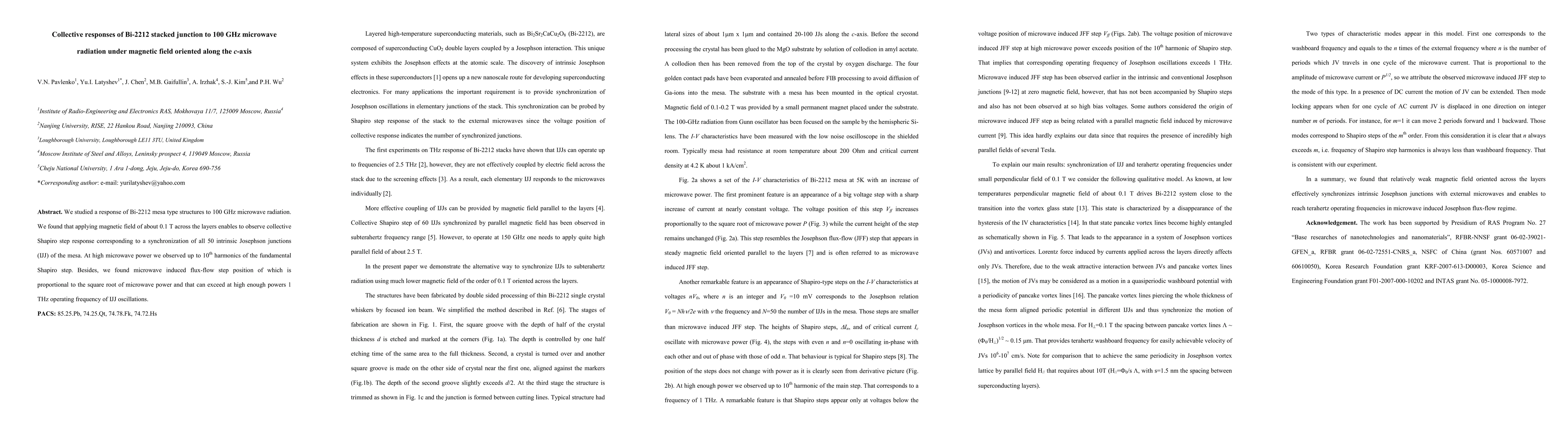 We studied a response of Bi-2212 mesa type structures to 100 GHz microwave radiation. We found that applying magnetic field of about 0.1 T across the layers enables to observe collective Shapiro step response corresponding to a synchronization of all 50 intrinsic Josephson junctions (IJJ) of the mesa. At high microwave power we observed up to 10th harmonics of the fundamental Shapiro step. Besides, we found microwave induced flux-flow step position of which is proportional to the square root of microwave power and that can exceed at high enough powers 1 THz operating frequency of IJJ oscillations.