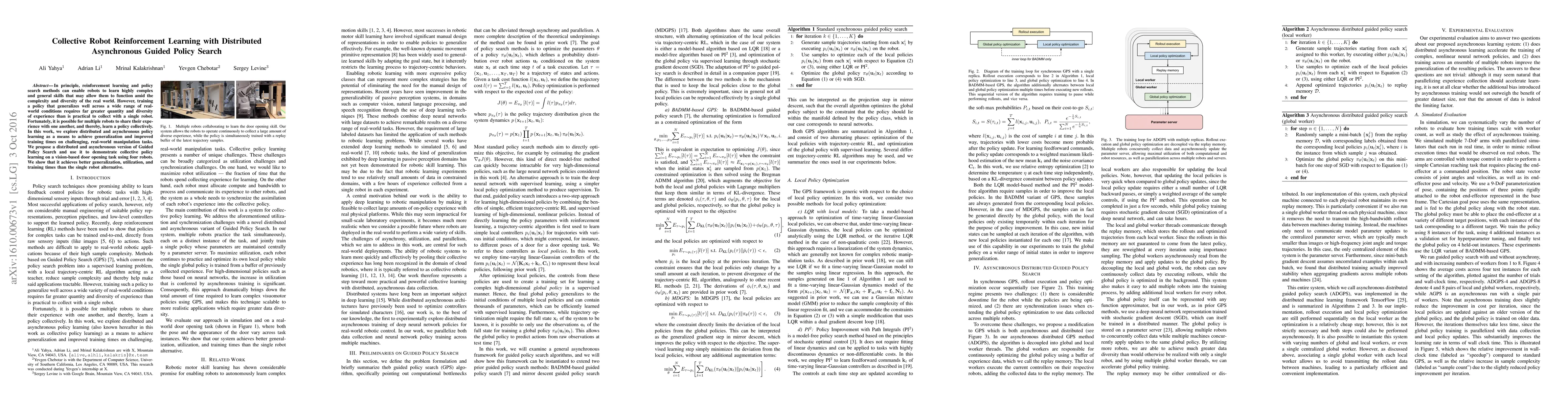 This paper proposes a distributed and asynchronous version of Guided Policy Search for collective reinforcement learning among multiple robots. It demonstrates improved generalization, efficiency, and training times for a vision-based door opening task through shared experiences among four robots compared to a single robot approach.