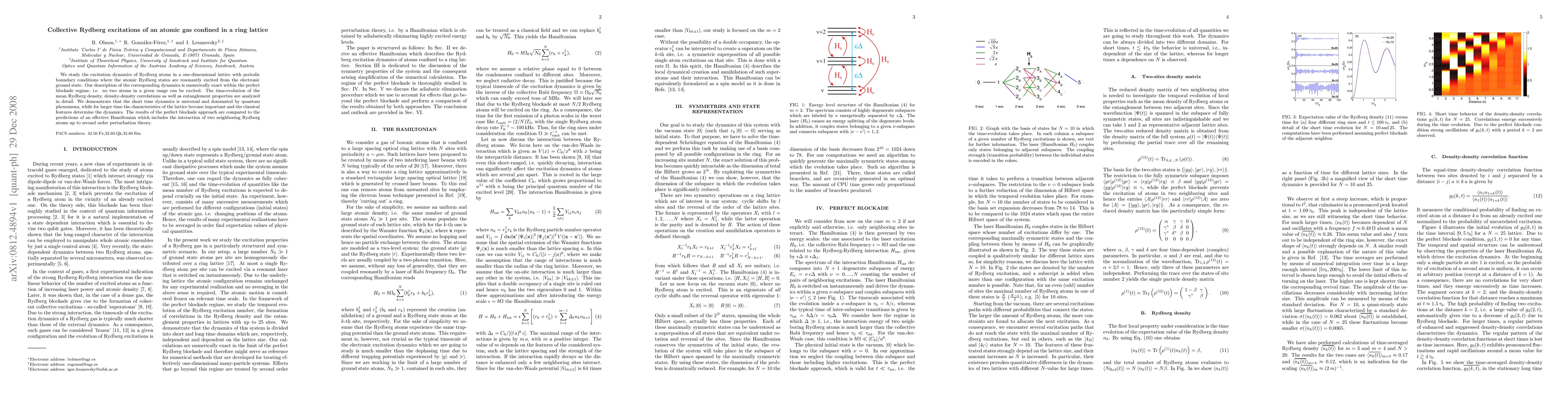 This paper investigates the dynamics of Rydberg atoms in a one-dimensional ring lattice, focusing on collective excitations under perfect blockade conditions. It reveals that quantum phenomena dominate initial dynamics, while classical features become significant over longer times, and compares these results with predictions from an effective Hamiltonian model.