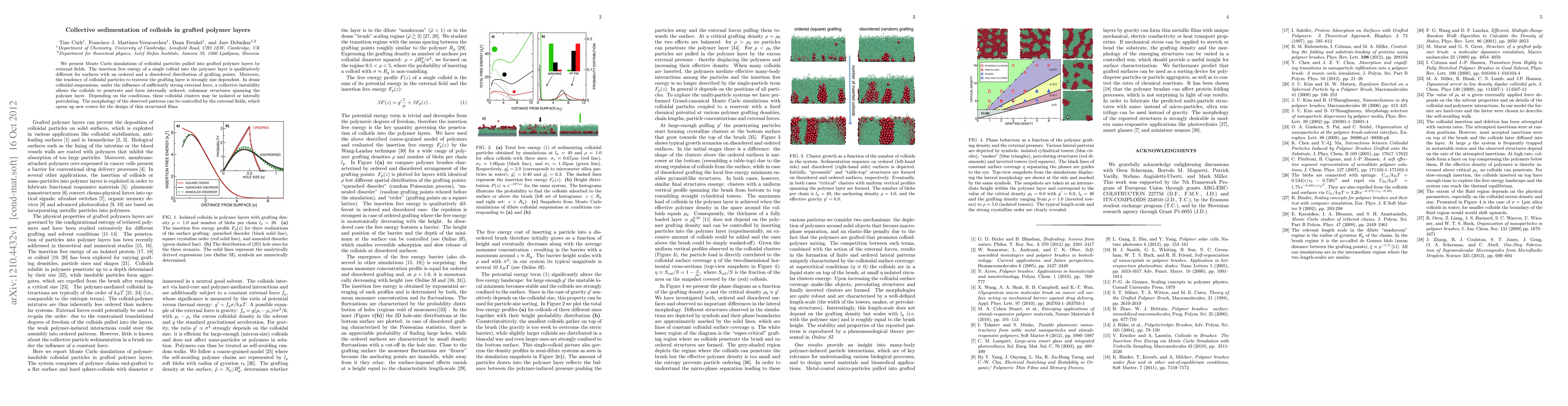 Monte Carlo simulations reveal that colloidal particles in grafted polymer layers exhibit different insertion free energies based on the grafting point distribution, leading to collective sedimentation and formation of internally ordered columnar structures under strong external forces. The morphology of these structures can be controlled by external fields, offering new avenues for designing thin, structured films.