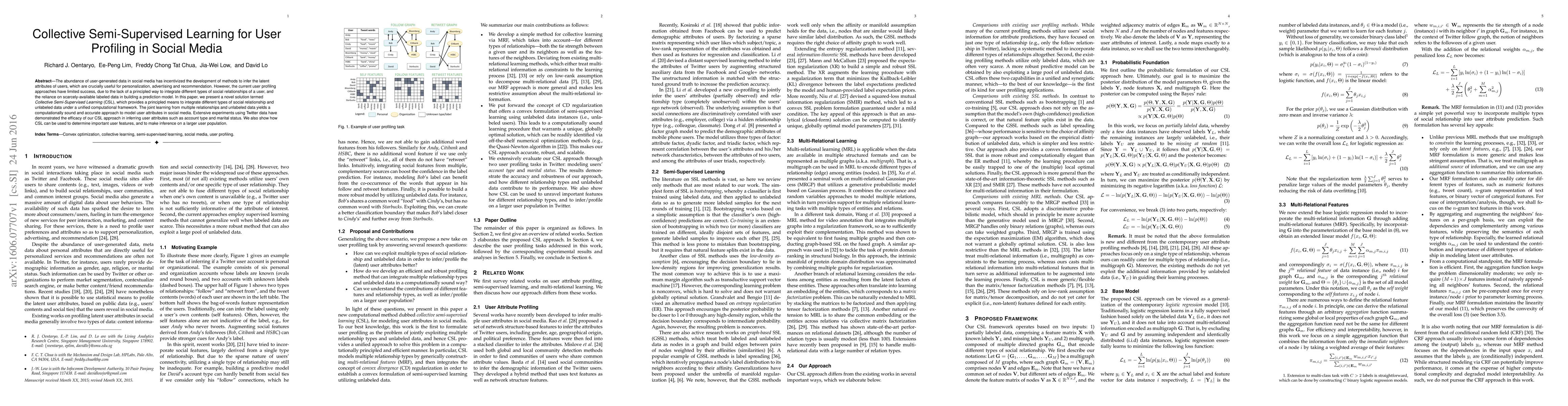 This paper introduces Collective Semi-Supervised Learning (CSL) for user profiling in social media, leveraging both social relationships and unlabeled data to infer user attributes accurately. Experiments on Twitter data show CSL's effectiveness in determining user features like account type and marital status.