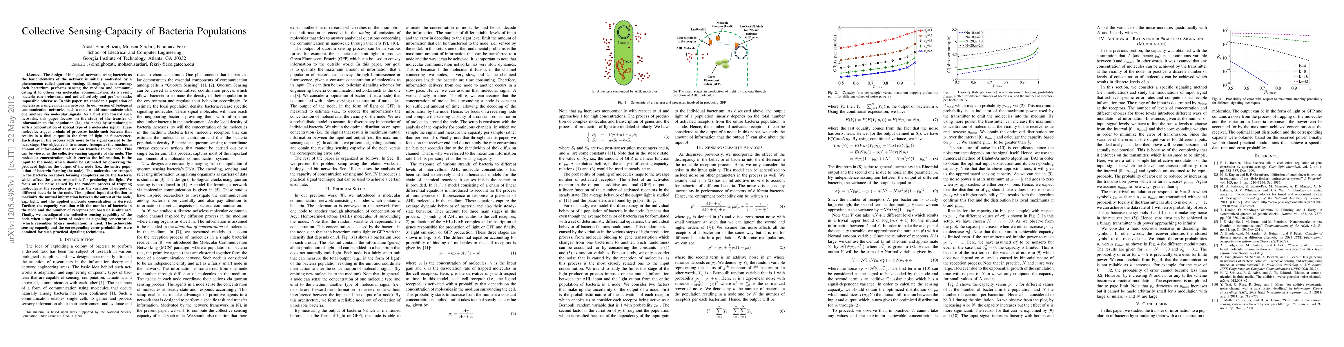 The design of biological networks using bacteria as the basic elements of the network is initially motivated by a phenomenon called quorum sensing. Through quorum sensing, each bacterium performs sensing the medium and communicating it to others via molecular communication. As a result, bacteria can orchestrate and act collectively and perform tasks impossible otherwise. In this paper, we consider a population of bacteria as a single node in a network. In our version of biological communication networks, such a node would communicate with one another via molecular signals. As a first step toward such networks, this paper focuses on the study of the transfer of information to the population (i.e., the node) by stimulating it with a concentration of special type of a molecules signal. These molecules trigger a chain of processes inside each bacteria that results in a final output in the form of light or fluorescence. Each stage in the process adds noise to the signal carried to the next stage. Our objective is to measure (compute) the maximum amount of information that we can transfer to the node. This can be viewed as the collective sensing capacity of the node. The molecular concentration, which carries the information, is the input to the node, which should be estimated by observing the produced light as the output of the node (i.e., the entire population of bacteria forming the node). We focus on the noise caused by the random process of trapping molecules at the receptors as well as the variation of outputs of different bacteria in the node. The capacity variation with the number of bacteria in the node and the number of receptors per bacteria is obtained. Finally, we investigated the collective sensing capability of the node when a specific form of molecular signaling concentration is used.