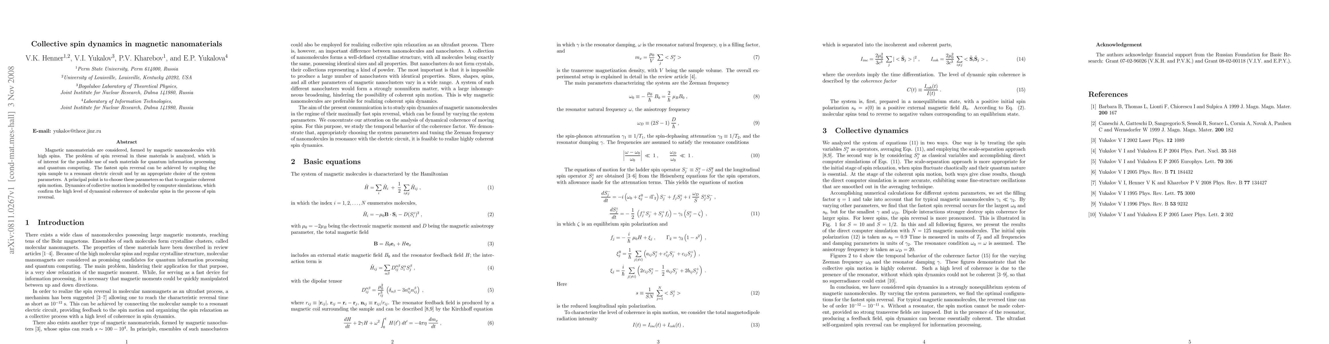 This paper investigates the collective spin dynamics in magnetic nanomaterials composed of high-spin nanomolecules, focusing on the rapid spin reversal facilitated by coupling to a resonant electric circuit. The study emphasizes optimizing system parameters to achieve coherent spin motion, validated by simulations showing high dynamical coherence during spin reversal, relevant for quantum information processing.