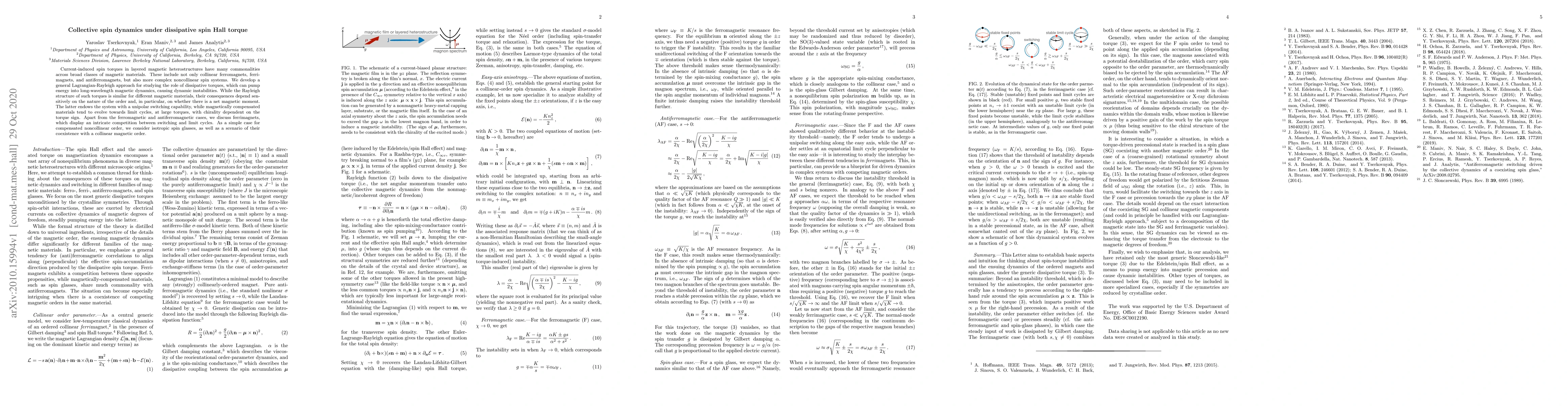 Current-induced spin torques in layered magnetic heterostructures have many commonalities across broad classes of magnetic materials. These include not only collinear ferromagnets, ferrimagnets, and antiferromagnets, but also more complex noncollinear spin systems. We develop a general Lagrangian-Rayleigh approach for studying the role of dissipative torques, which can pump energy into long-wavelength magnetic dynamics, causing dynamic instabilities. While the Rayleigh structure of such torques is similar for different magnetic materials, their consequences depend sensitively on the nature of the order and, in particular, on whether there is a net magnetic moment. The latter endows the system with a unipolar switching capability, while magnetically compensated materials tend to evolve towards limit cycles, at large torques, with chirality dependent on the torque sign. Apart from the ferromagnetic and antiferromagnetic cases, we discuss ferrimagnets, which display an intricate competition between switching and limit cycles. As a simple case for compensated noncollinear order, we consider isotropic spin glasses, as well as a scenario of their coexistence with a collinear magnetic order.