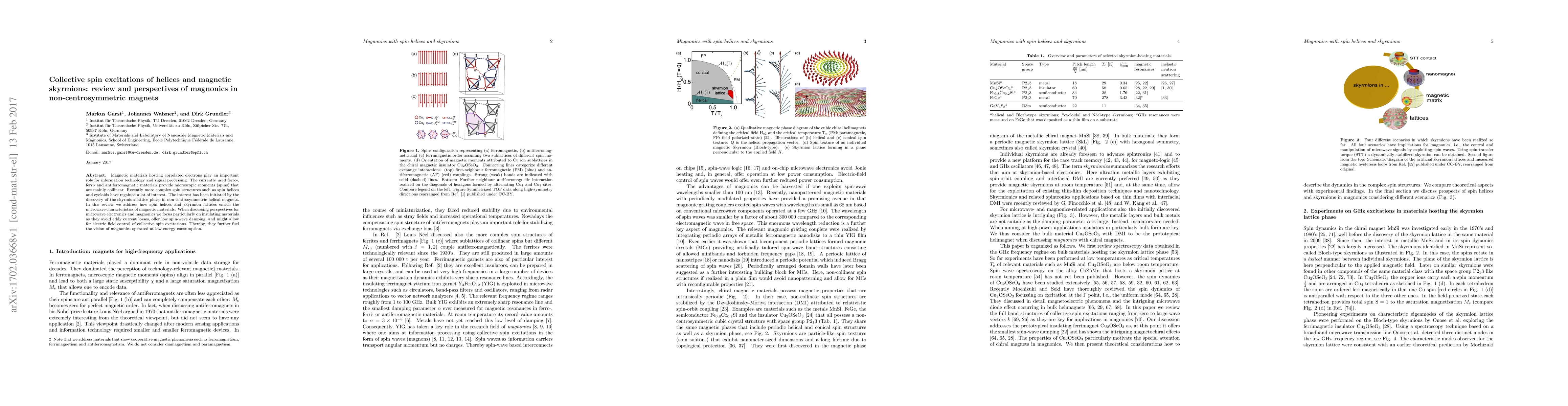 Magnetic materials hosting correlated electrons play an important role for information technology and signal processing. The currently used ferro-, ferri- and antiferromagnetic materials provide microscopic moments (spins) that are mainly collinear. Recently more complex spin structures such as spin helices and cycloids have regained a lot of interest. The interest has been initiated by the discovery of the skyrmion lattice phase in non-centrosymmetric helical magnets. In this review we address how spin helices and skyrmion lattices enrich the microwave characteristics of magnetic materials. When discussing perspectives for microwave electronics and magnonics we focus particularly on insulating materials as they avoid eddy current losses, offer low spin-wave damping, and might allow for electric field control of collective spin excitations. Thereby, they further fuel the vision of magnonics operated at low energy consumption.