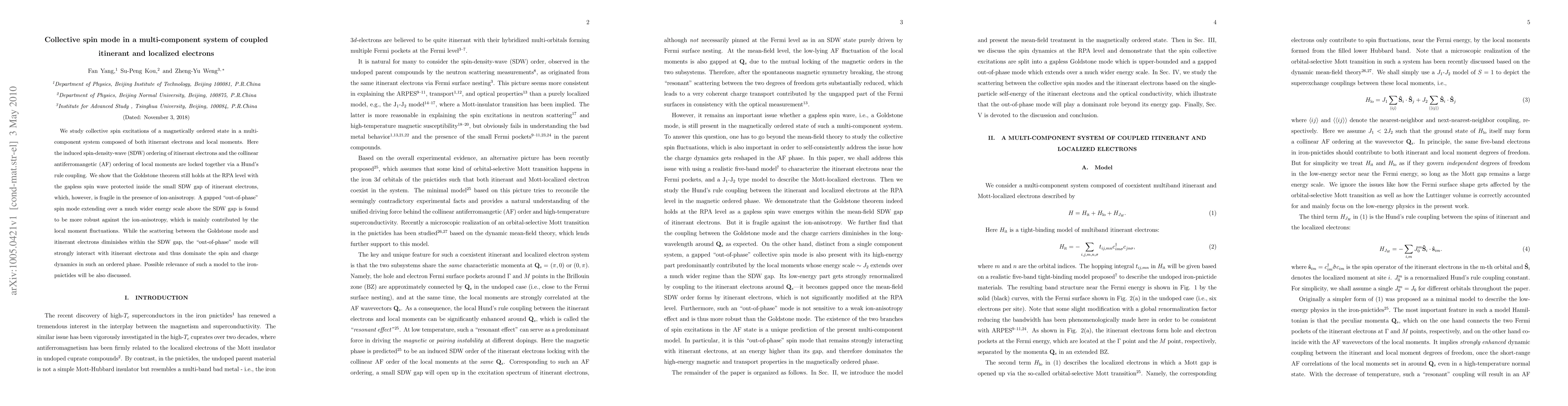 This paper investigates collective spin excitations in a multi-component system with both itinerant and localized electrons, revealing a gapless spin wave within the small spin-density-wave gap, alongside a more robust, gapped out-of-phase spin mode influenced by local moment fluctuations, which dominates spin and charge dynamics in the magnetically ordered state.