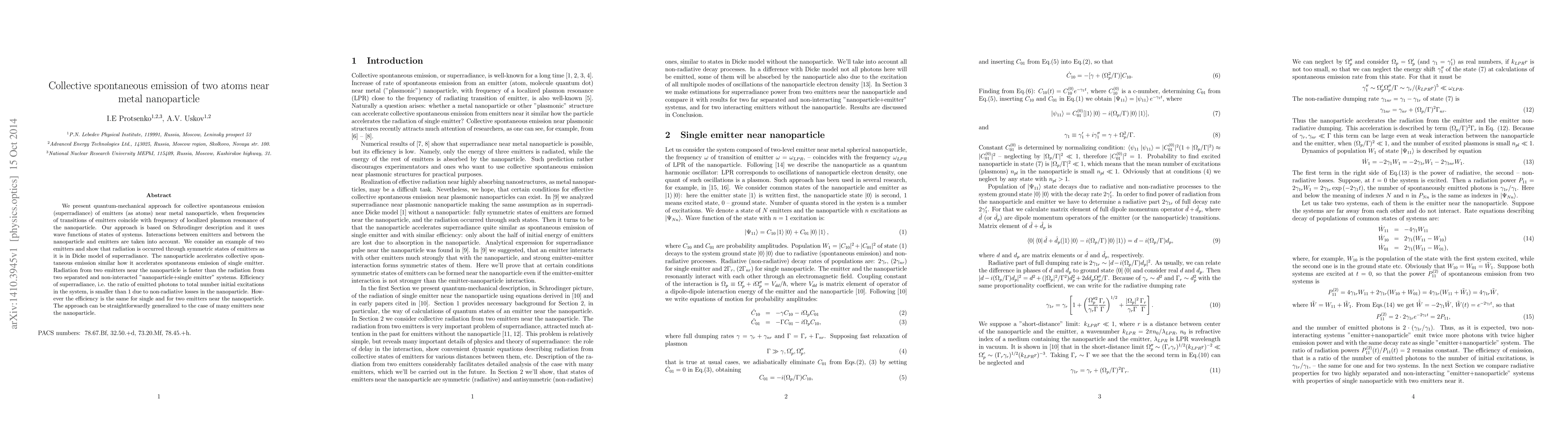 This paper explores quantum-mechanical collective spontaneous emission (superradiance) of two atoms near a metal nanoparticle, showing that the nanoparticle enhances emission similar to a single emitter but with faster radiation due to interactions. The efficiency of superradiance remains the same for single and two emitters despite non-radiative losses.