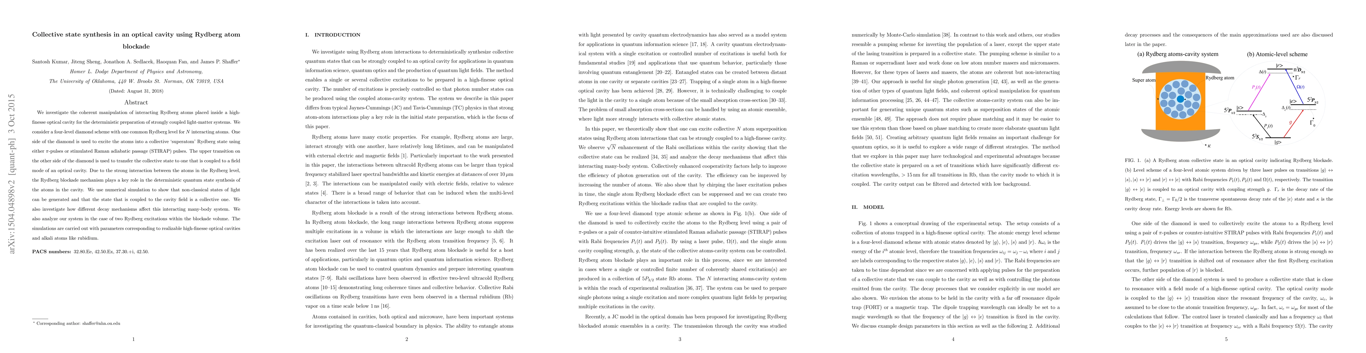 This paper explores the coherent manipulation of Rydberg atoms within an optical cavity to create a strongly coupled light-matter system, utilizing Rydberg blockade for deterministic quantum state synthesis. Numerical simulations demonstrate the generation of non-classical light states and the impact of decay mechanisms on the collective state.