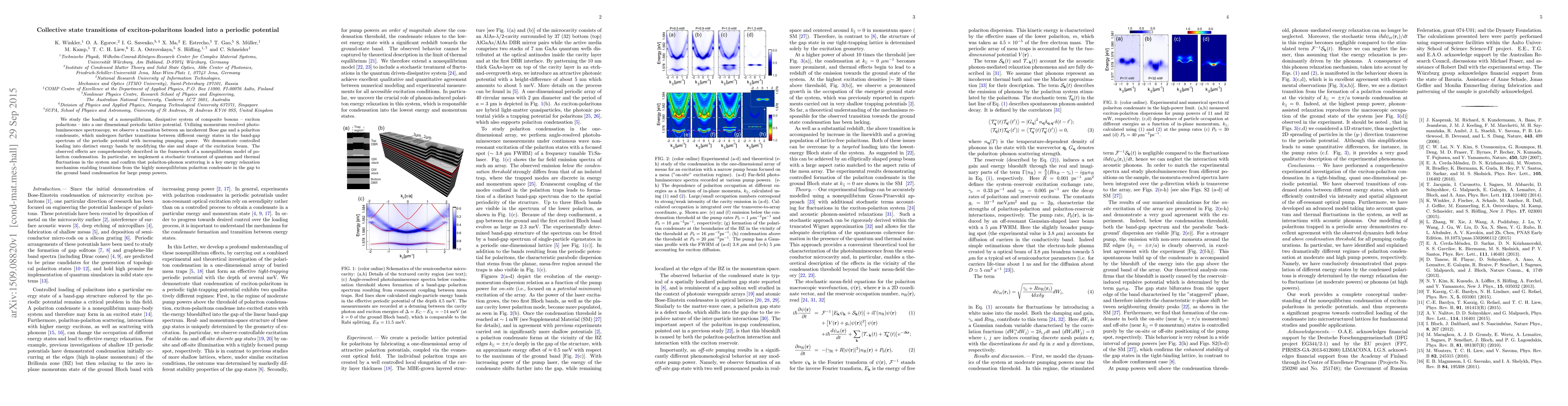 This paper investigates the collective state transitions of exciton-polaritons in a one-dimensional periodic potential, observing a transition from an incoherent Bose gas to a polariton condensate and further band-gap transitions with increased pumping power. The study highlights the role of polariton-phonon scattering in energy relaxation and the influence of excitation beam parameters on loading into distinct energy bands.