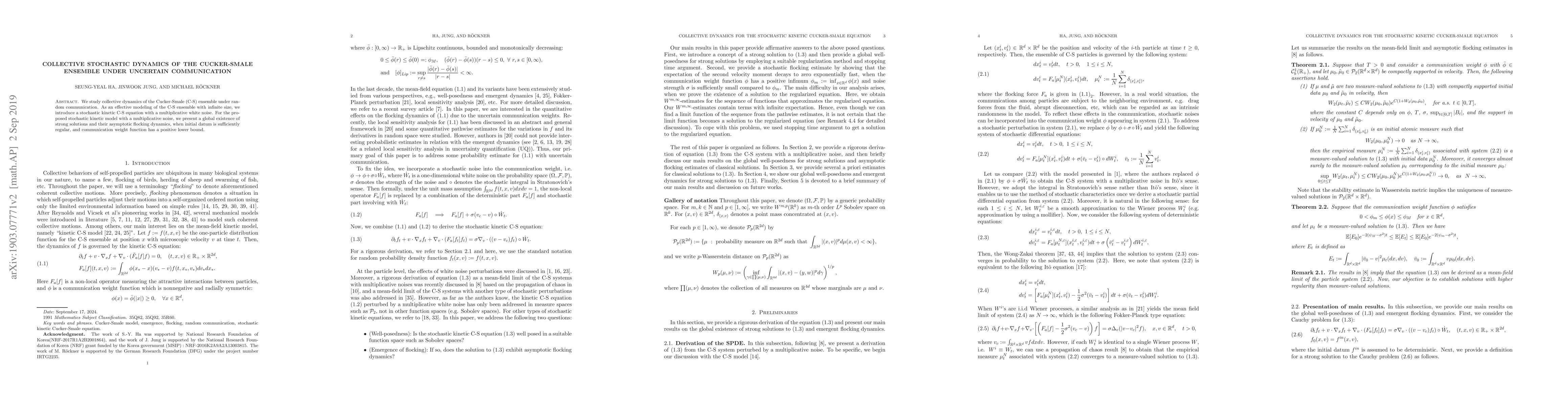 We present collective dynamics of the Cucker-Smale (C-S) ensemble under random communications. As an effective modeling of the C-S ensemble, we introduce a stochastic kinetic C-S equation with a multiplicative white noise. For the proposed stochastic kinetic model with a multiplicative noise, we present a global well-posedness of strong solutions and their asymptotic flocking dynamics, when initial datum is sufficiently regular, and communication weight function has a positive lower bound.